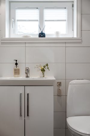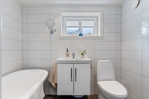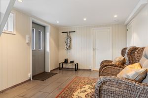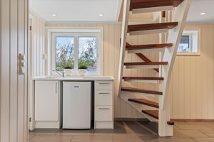 Kjelleretasje: -Gangen og badet er renovert for ca. 8 år siden. Fliser på gulv i gang med varmekabler. lyse mdf panel vegger, downlights i tak og en enkel kjøkkeninnredning med vask, kjøleskap, skapplass og platetopp. Badet er helfliset med varmekabler i gulv og inneholder: toalett, servant i baderomsmøbel og badekar. Lyst og fint bad. -Romslig oppbevaringsrom/hobbyrom med egen vedovn. -Bod innredet med den gamle kjøkkeninnredningen. Rommet inneholder sluk og vanntilførsel. -Stort rom, som er blitt disponert som soverom/kjellerstue. Varmekabler i gulv.