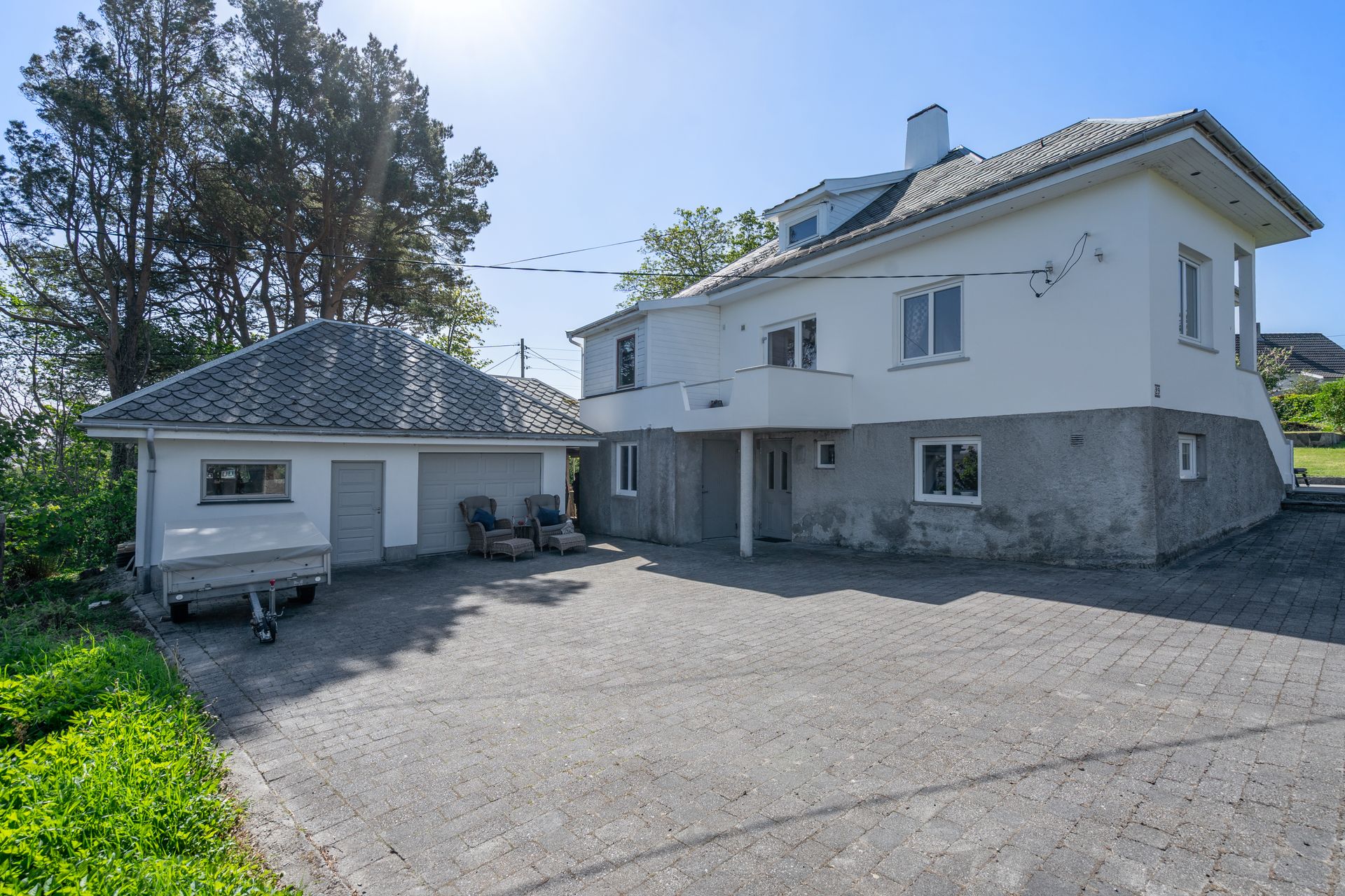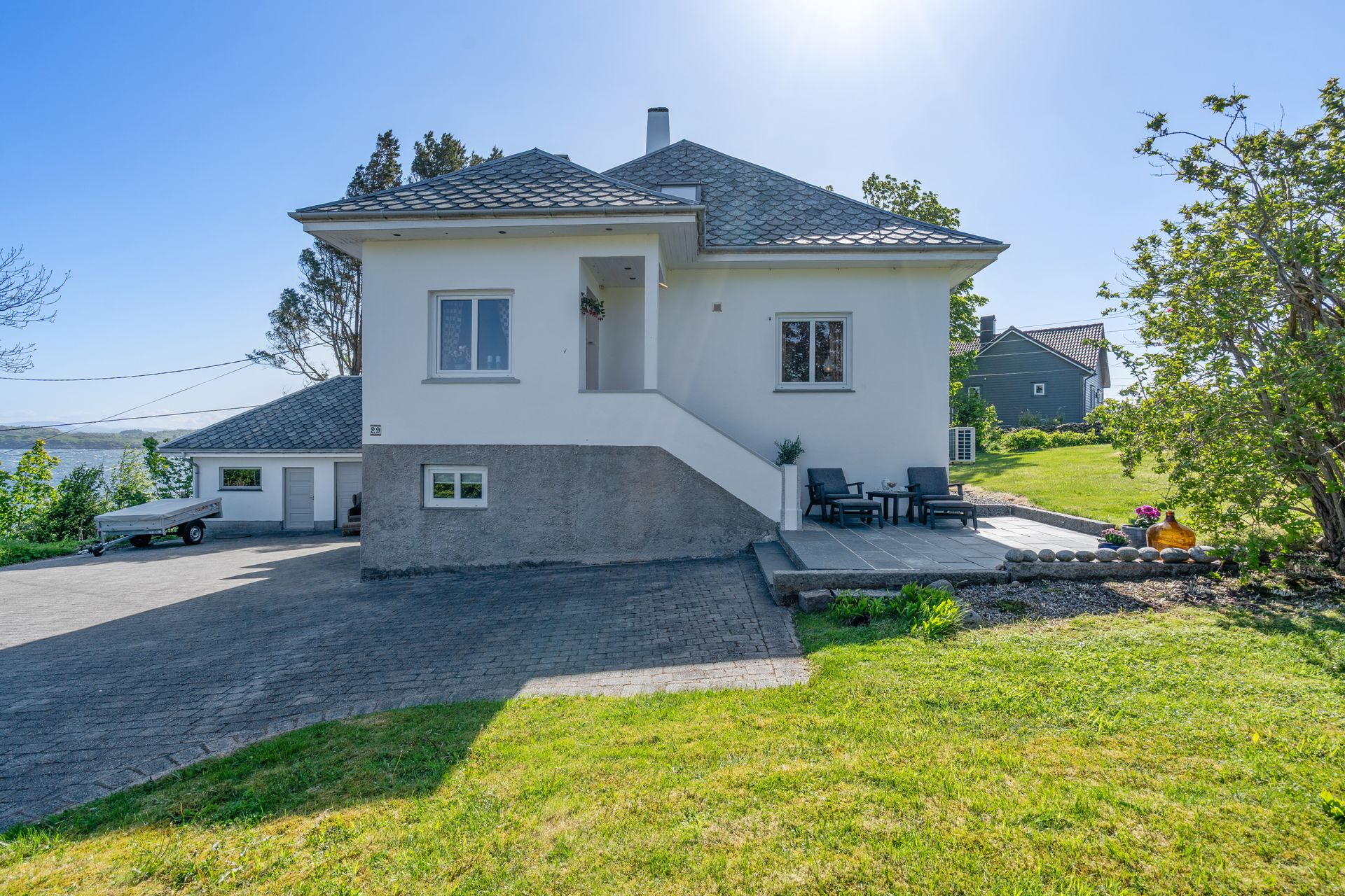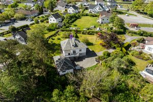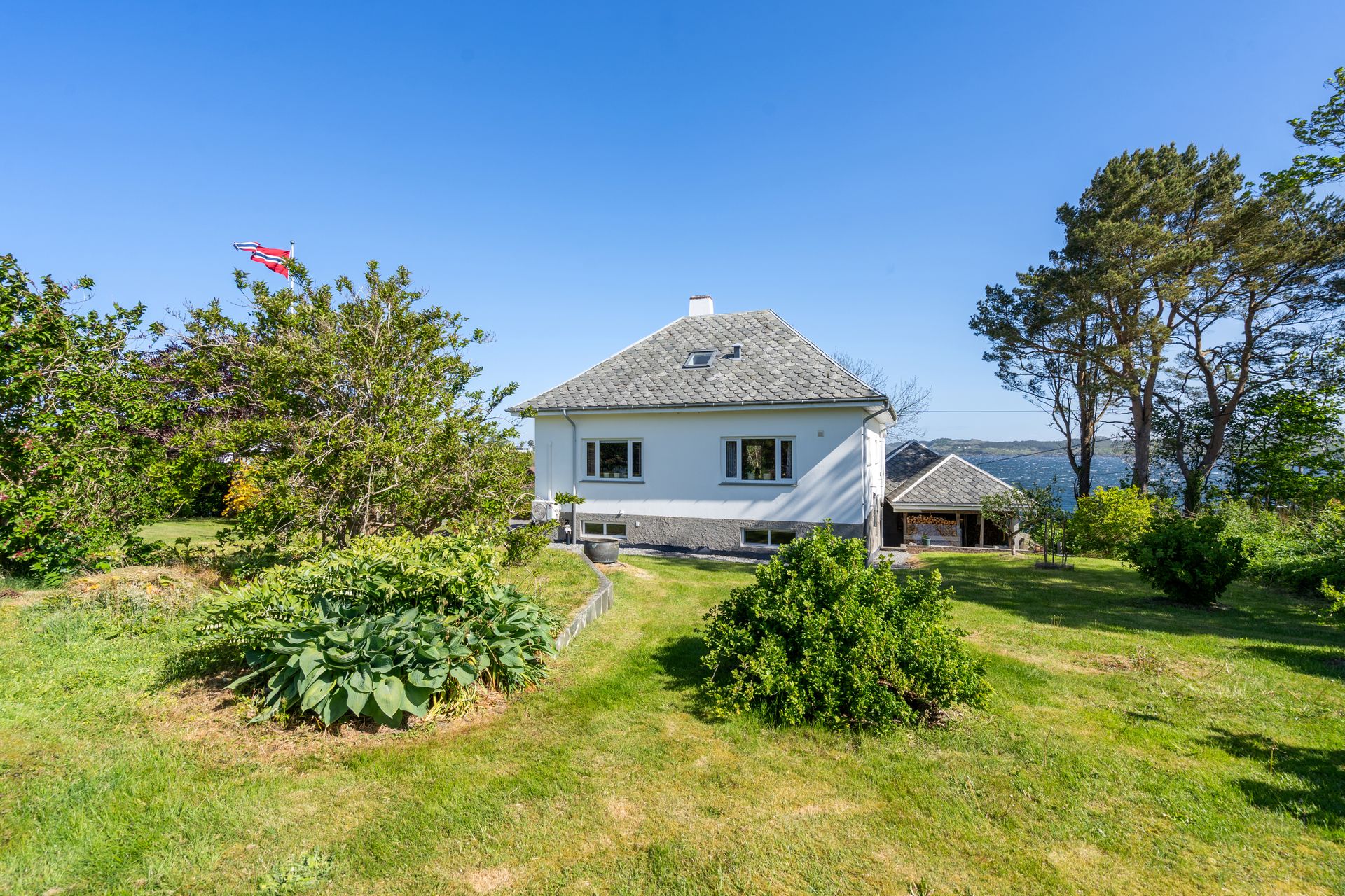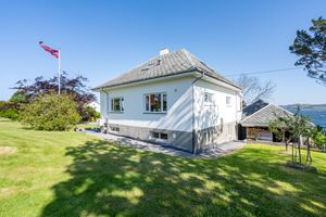 Staslig eiendom med flott velholdt murhus – Nydelig sjøutsikt - Garasje – Stor tomt m/bærbusker og frukttrær