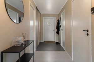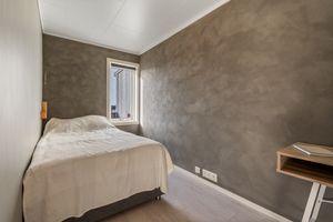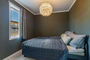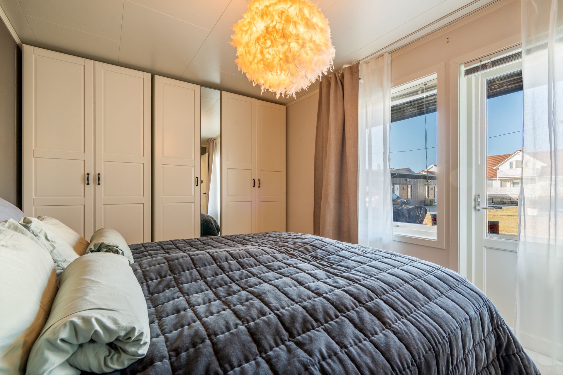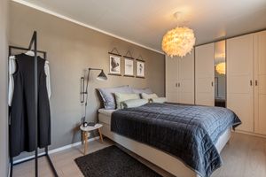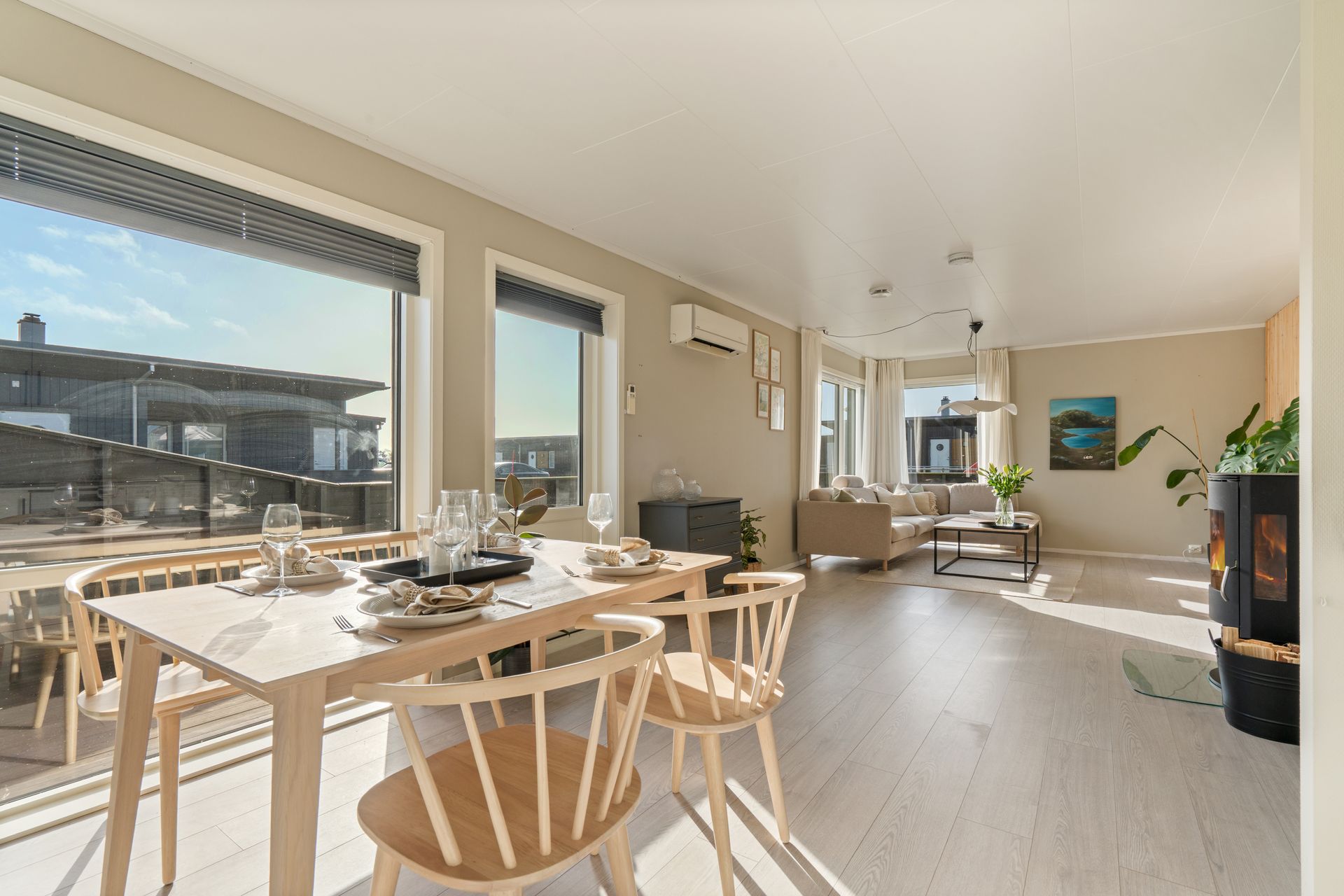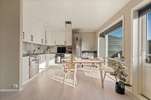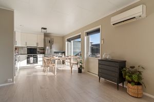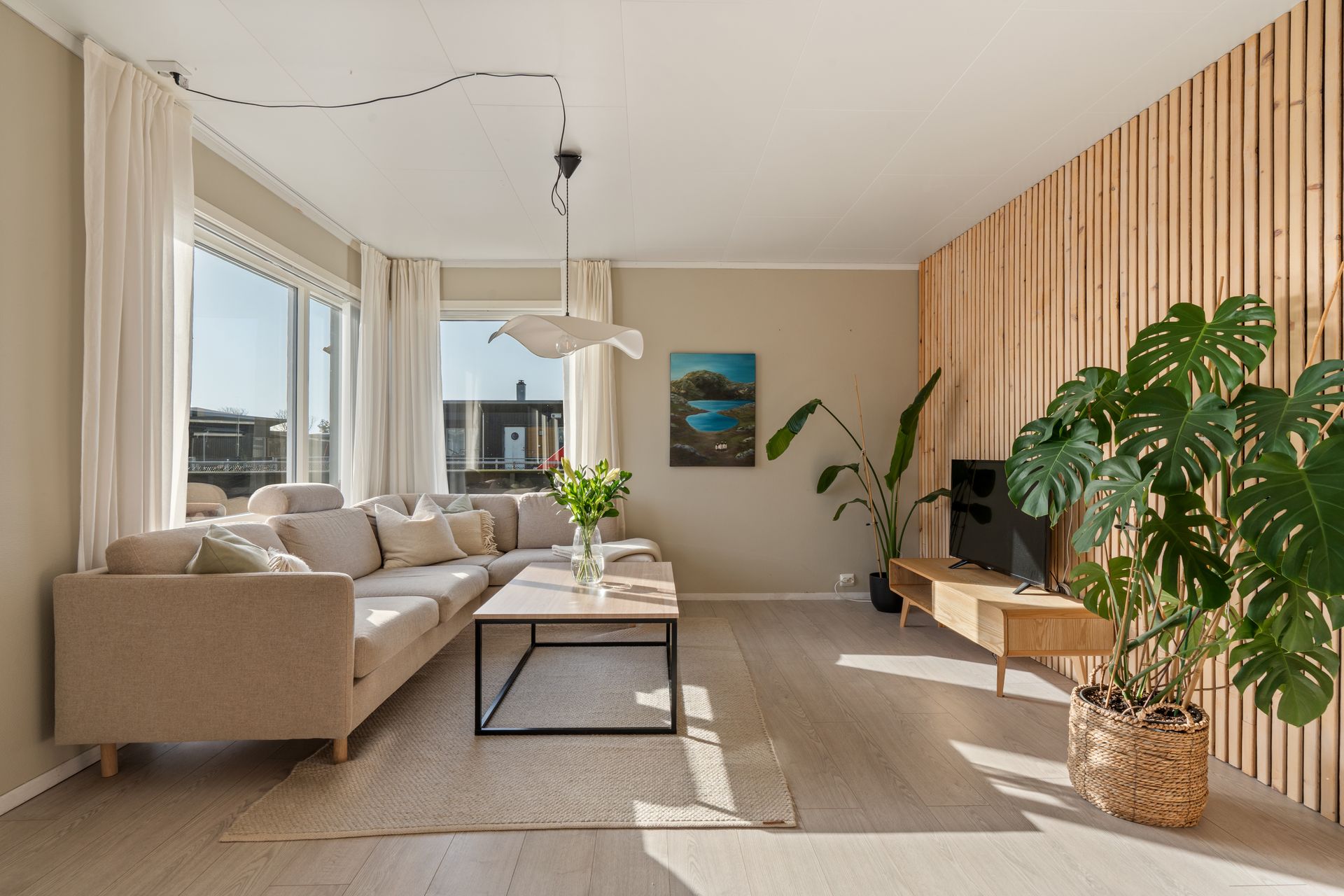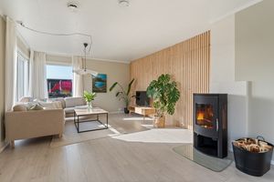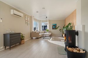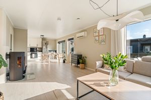 -Gjennomgående lys laminat på gulvoverflater, med unntak av entrè og baderom som har fliser. Vaskerom med gulvbelegg. -Lyse og tidsriktige farger på vegger. -Praktisk planløsning med 3 soverom (Lettvegg til det minste soverommet, kan enkelt omgjøres til større stue ved behov.) Hovedsoverommet inneholder stor praktisk garderobe og har egen terrassedør med tilhørende platting. -Stue og kjøkken i åpen løsning. Rikelig med naturlig dagslys gjennom de store vinduene. Komfortabel oppvarming med varmepumpe, samt ekstra oppvarming med vedfyring. Kjøkkeninnredningen er lys og tidløs, og inneholder rikelig med benke/skap- plass. Integrert nyere oppvaskmaskin, komfyr og induksjonstopp som medfølger handelen. Pene detaljer i kjøkkensonen med sorte håndtak og stikkontakter. -Fra stue/kjøkken rommet er det direkte adkomst til stor og lun sør/vest vendt terrasse. -Praktisk skyvedørsgarderobe i entrè. -Svært romslig helfliset bad med dusjhjørne, vegghengt toalett, servantskap med oppbevaring og speil. -Praktisk vaskerom/teknisk rom. Nylig (25. februar 2026) utført service/rens inkludert filterbytte av ventilasjonsanlegget. (Utført av Enkon) -Utvendig sportsbod med plass til oppbevaring.