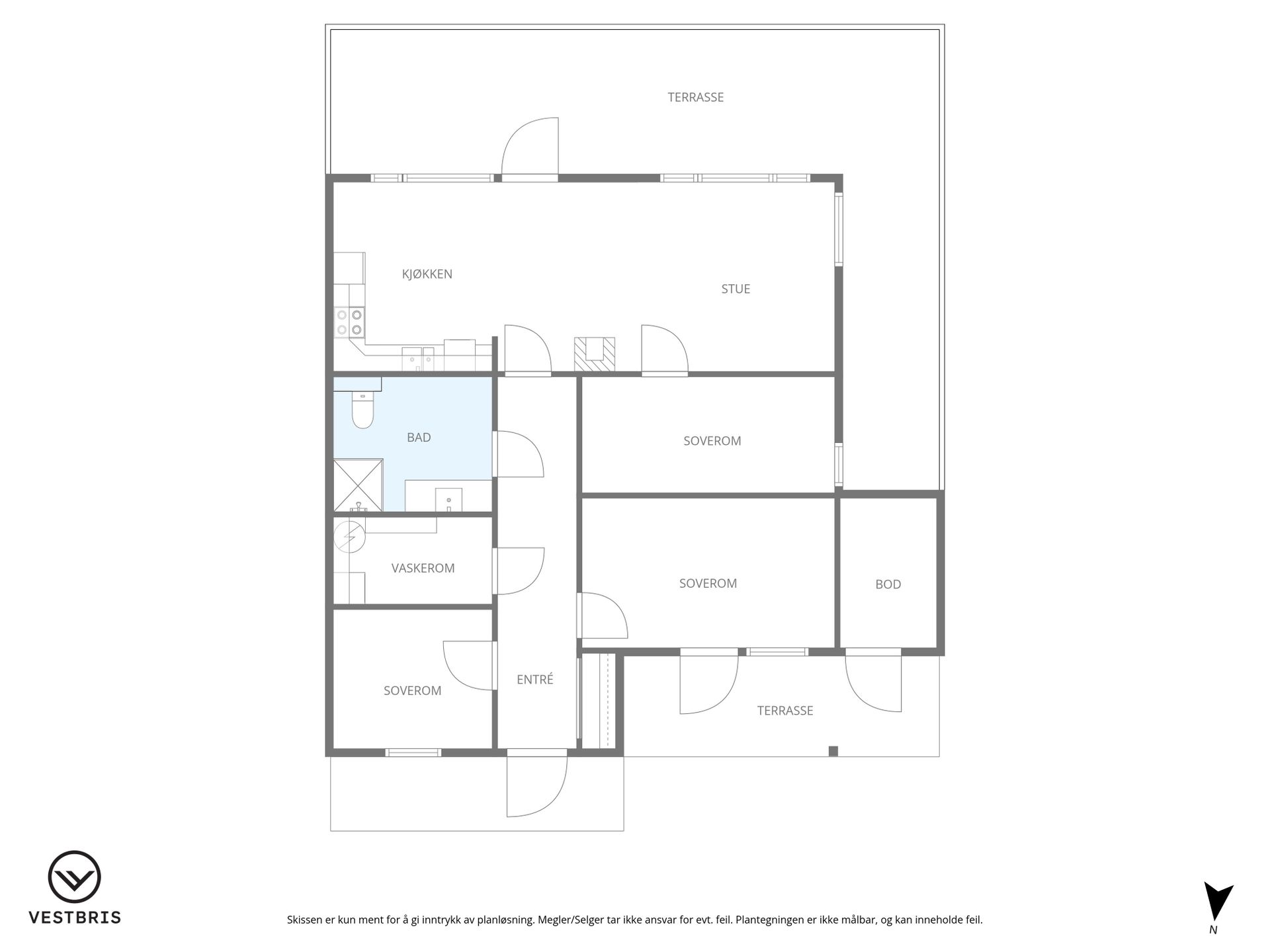 Leiligheten inneholder: Gang, 3 soverom, stue/kjøkken, bad og bod/vaskerom. Terrasse og utvendig bod.