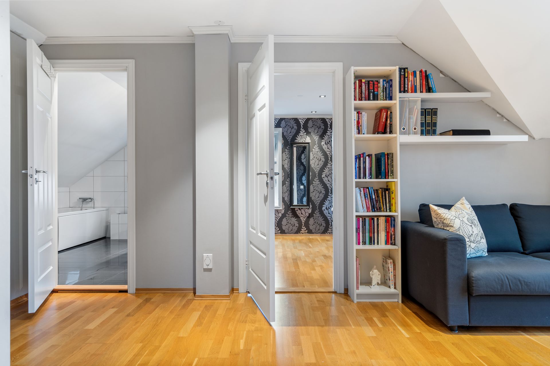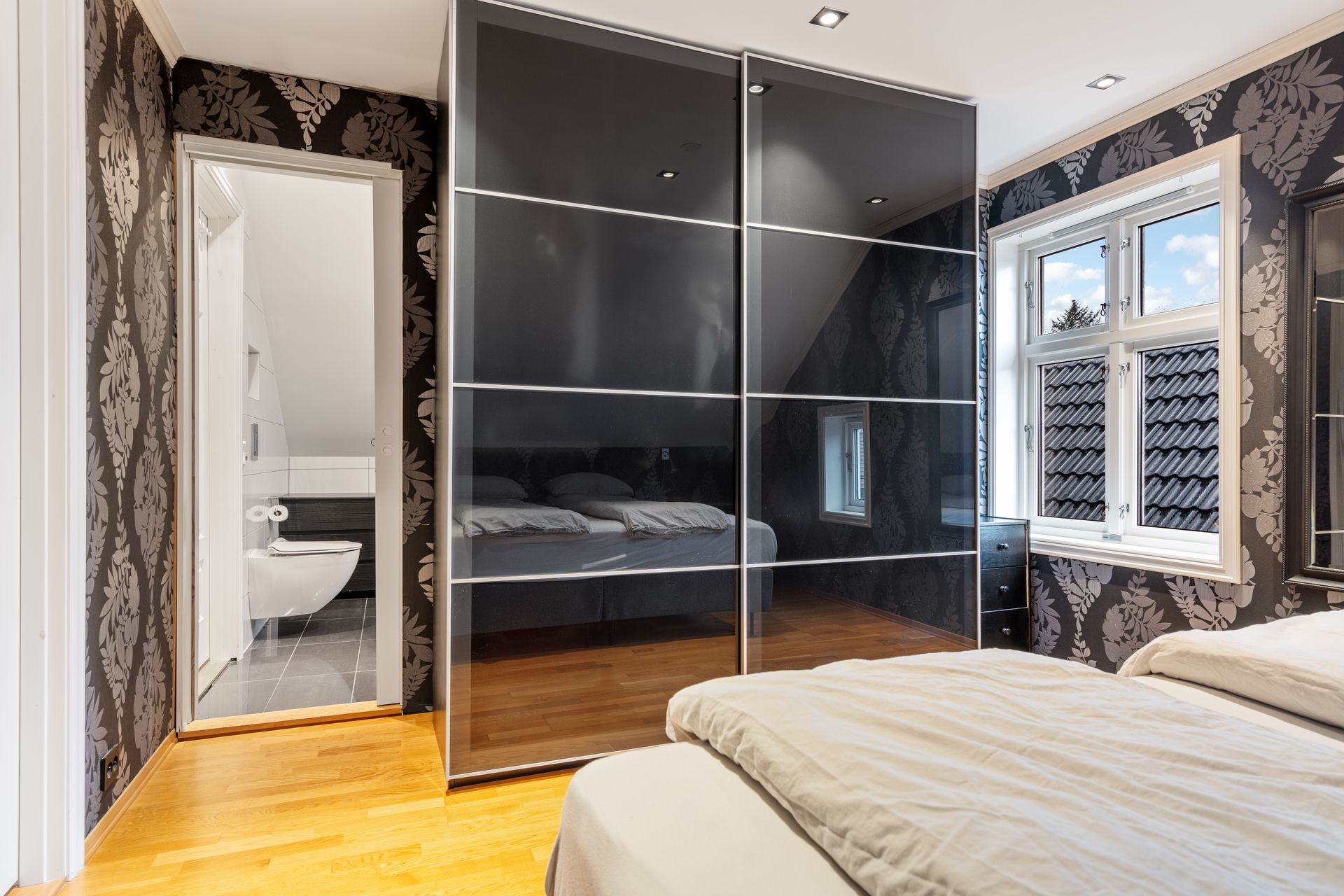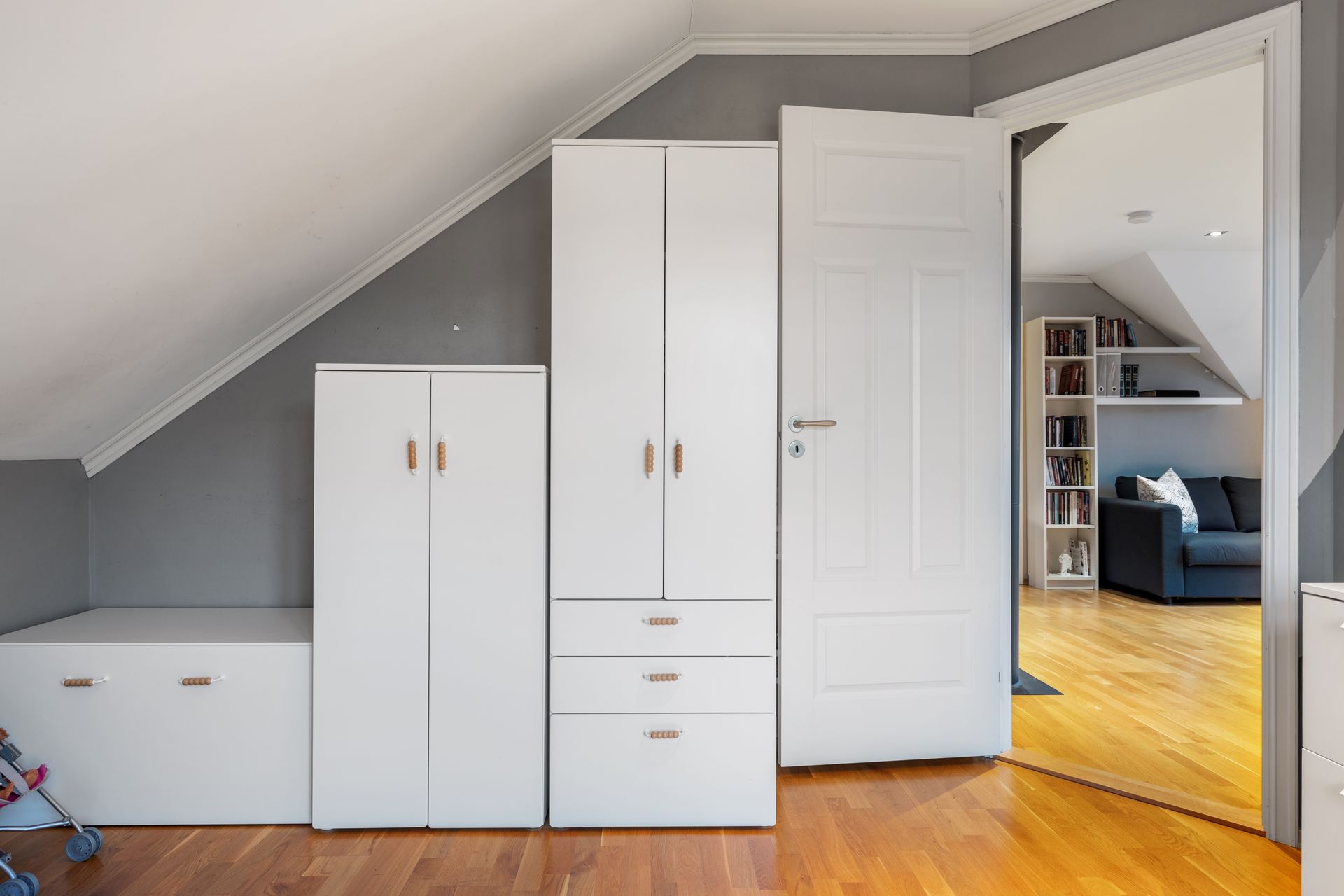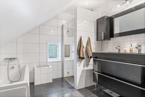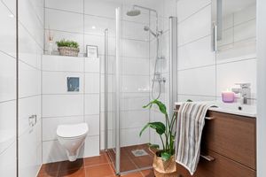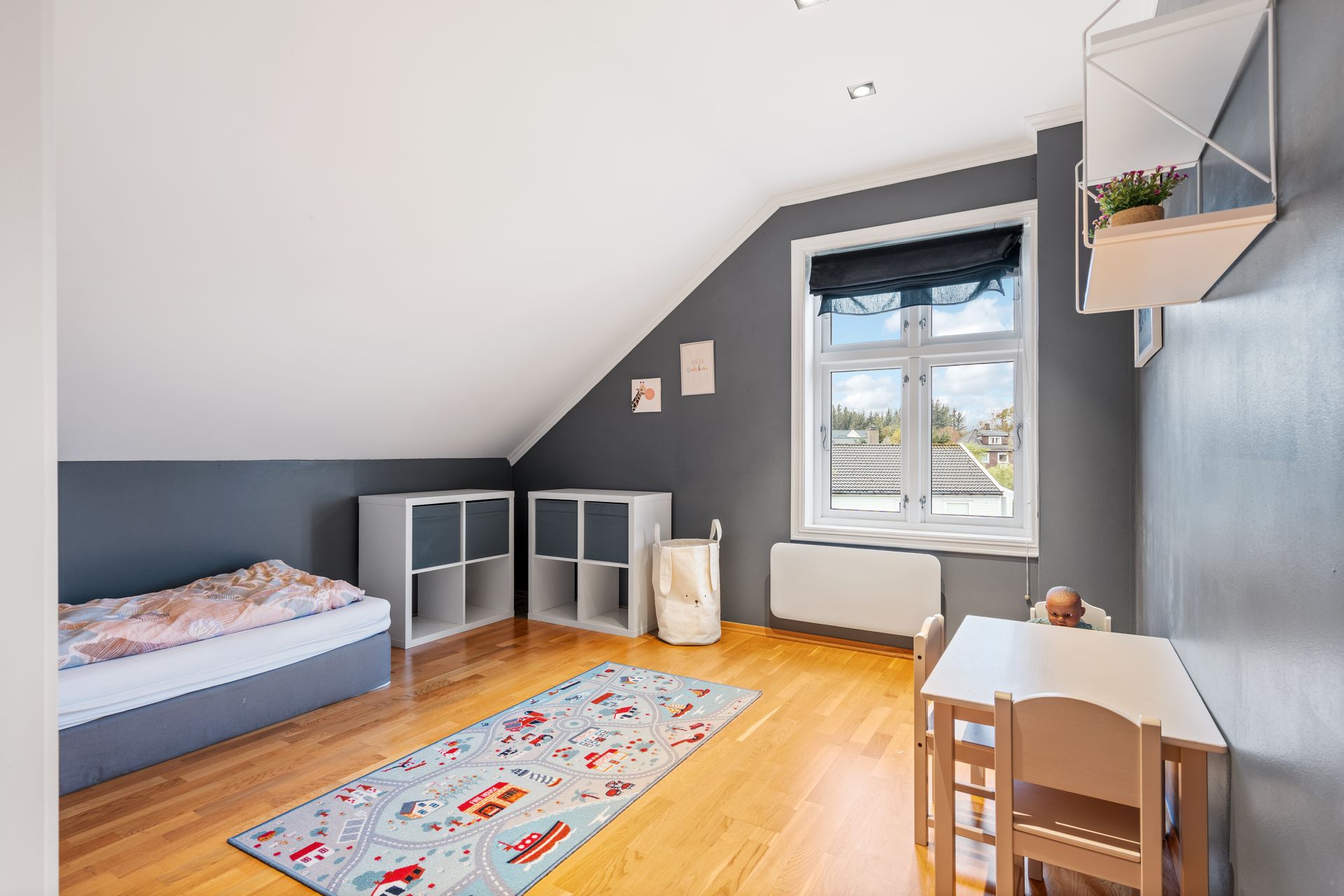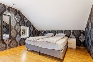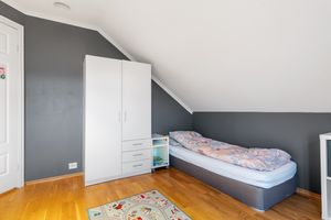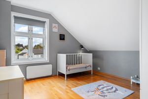 -Her er det 3 gode soverom. 2 soverom som egner seg utmerket som barnerom, med god plass til seng og leker. Hovedsoverommet er romslig og inneholder skyvedørsgarderobe. Deilig med mørk farge på vegg når det er lyst ute. Direkte adkomst til bad fra hovedsoverommet.
