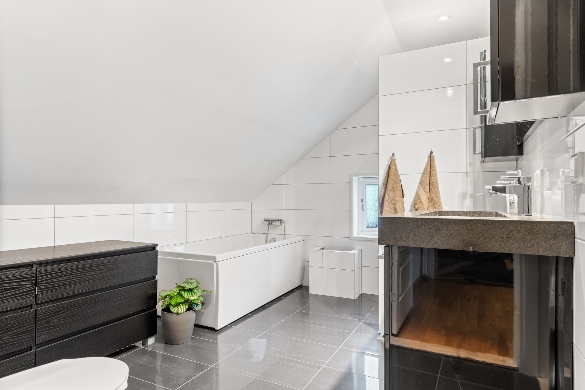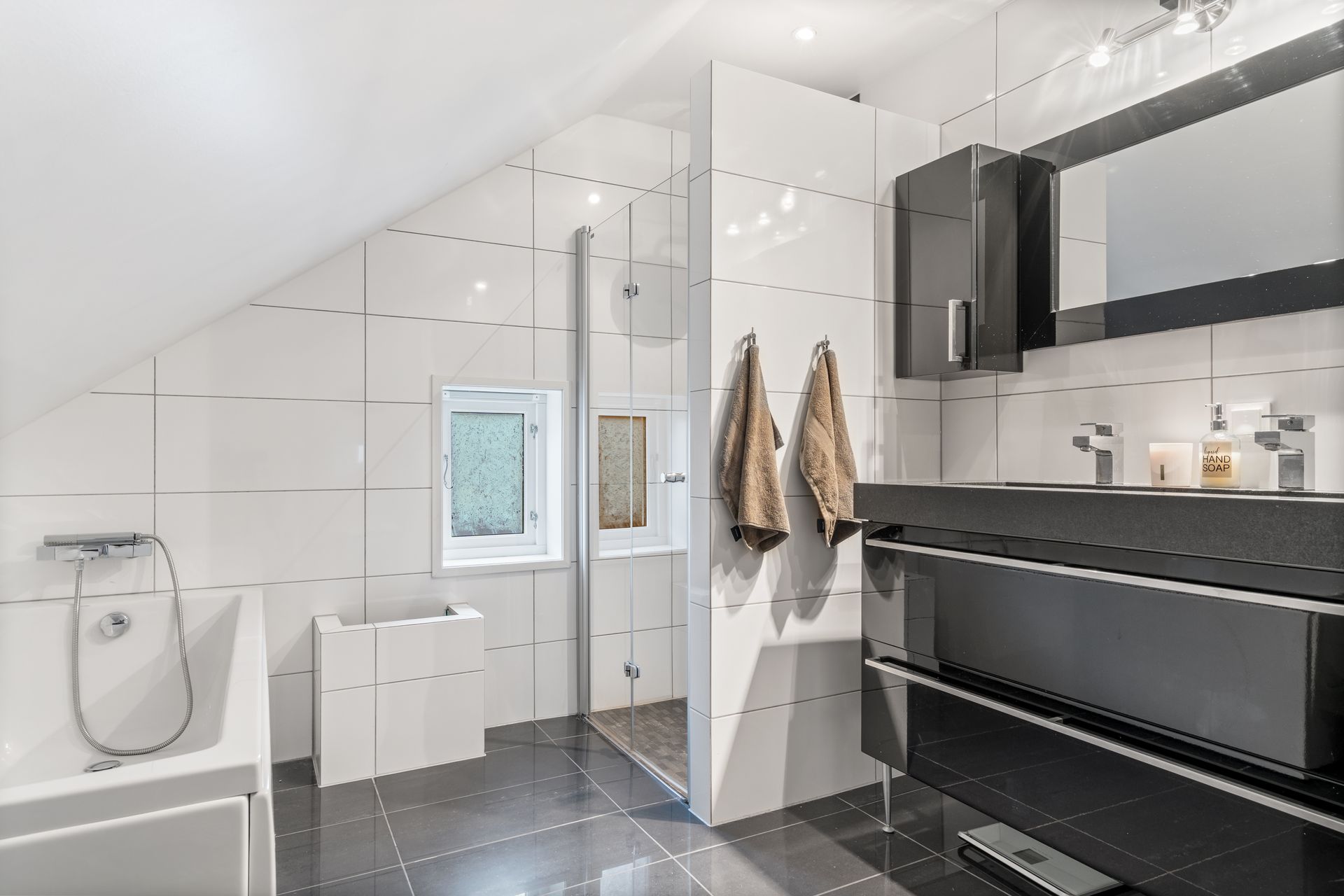 -Helfliset bad med dusjhjørne, badekar, baderomsmøbel med vask, toalett. Downlights belysning i tak.