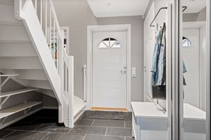 *Første etasje: -Romslig flislagt entrè med muligheter for oppbevaring. Tilknyttet entrè finner du et flislagt bad som inneholder dusj, toalett og vask. -Romslig og lys stue i vinkel. Rikelig med naturlig dagslys gjennom store vinduer. Stuen er utformet med naturlige møbleringssoner, med god plass til stor hjørnesofa i tv- kroken, sosial sone og spisegruppe. Skjult opplegg for ledninger bak tv vegg om ønskelig. Det er både varmepumpe og vedovn som oppvarmingskilder. Overflater er pusset opp med nytt laminat gulv, malt vegger og ny terrassedør i 2019. -Kjøkken: Praktisk kjøkkeninnredning med god benke og skapplass. Kjøkkenet er utstyrt med integrerte hvitevarer (unntak frittstående kjøleskap). I innredningen er det dowlights belysning under overskap, samt "støvsuger" løsning i nedre kant av foringslist (genialt for småbarnsforeldre). Ellers et veldig lyst og innbydende rom med god plass til spisebord. Downlights belysning i tak og pusset opp med samme laminatgulv som i stuen. -Vaskerom: Praktisk rom med egen bi-inngang med adkomst fra kjøkkenet. Innredning og skittentøy sjakt fra bad i loftsetasjen. Meget praktisk rom for småbarn/barne familier. Innforbi vaskerommet finner du et teknisk rom med muligheter for litt oppbevaring.