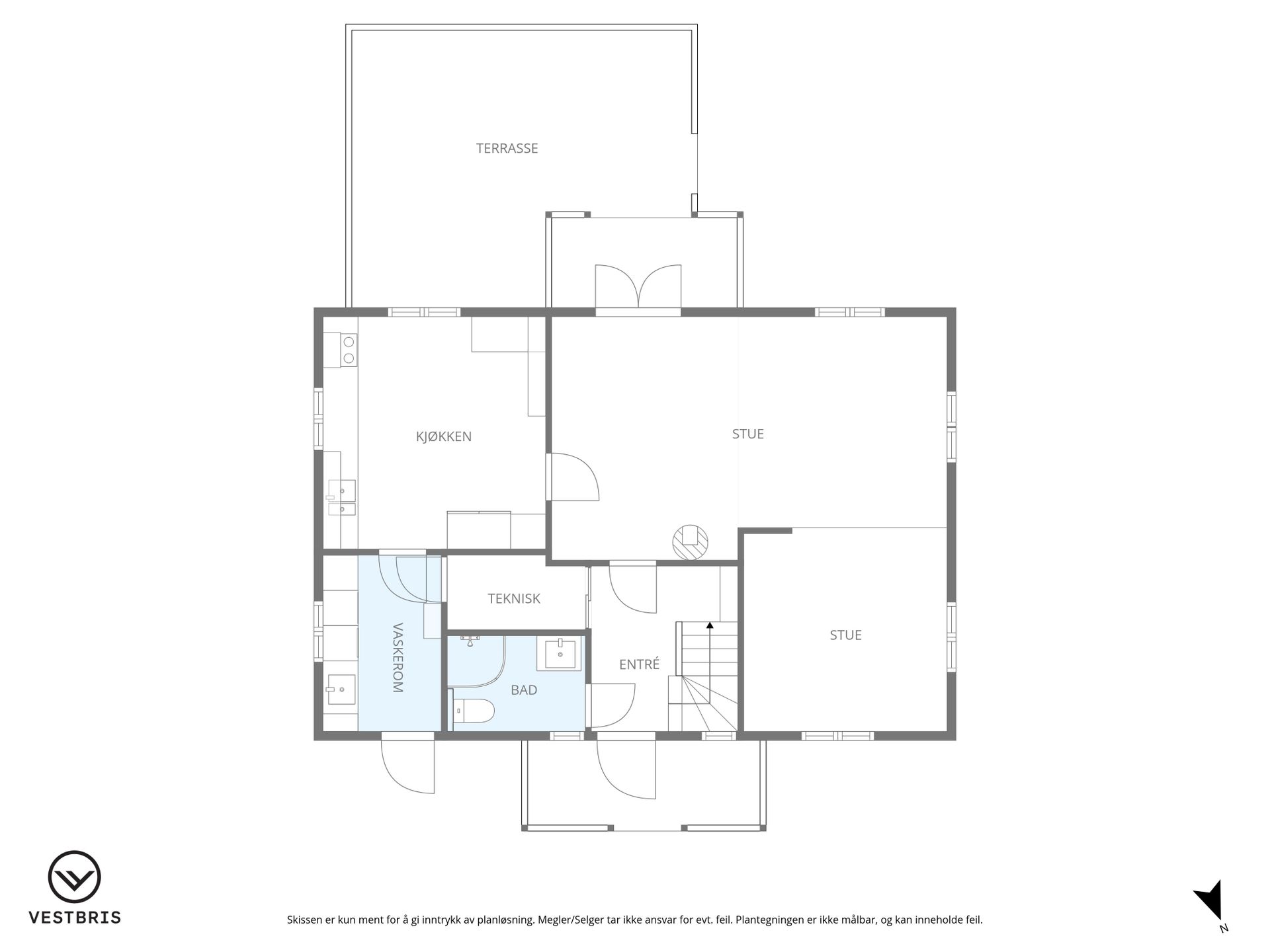 -Første etasje: Entrè, stue, kjøkken, bad, vaskerom, teknisk rom.