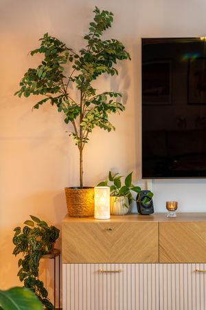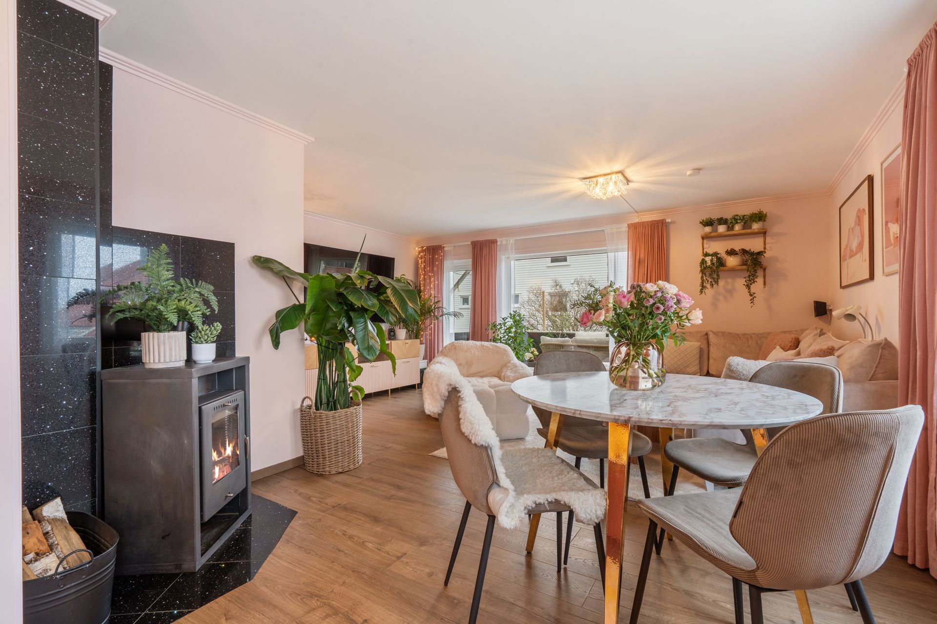Peisovn i stue. Elektrisk oppvarming. I de rom hvor det på visning ikke er montert panelovner, vil det heller ikke medfølge i handelen.
