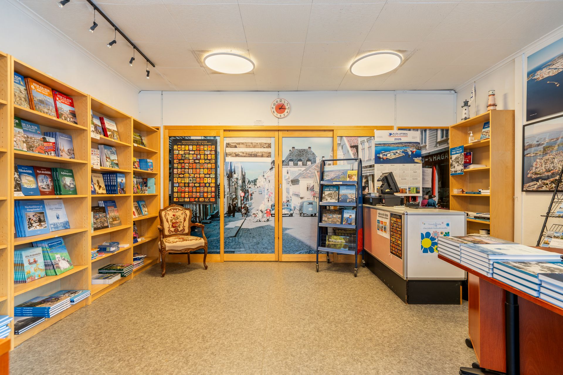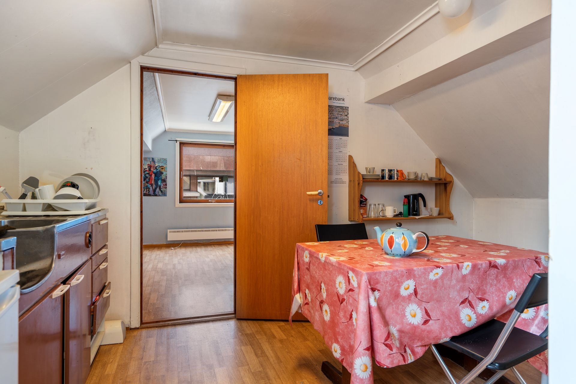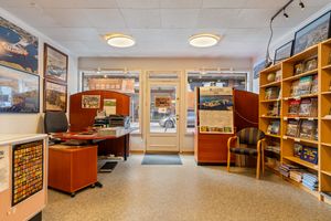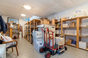 Butikklokale med inngang fra gaten. Skyvedører til lager med WC-rom og bøttekott. Trapp til loftsetasje med lager, enkelt kjøkken/spiseplass og kontor. Sørvestvendt gårdsrom/parkeringsplass.