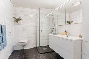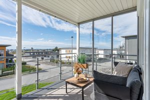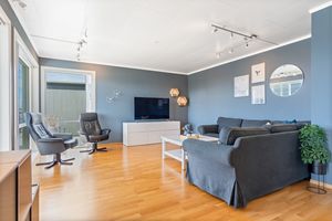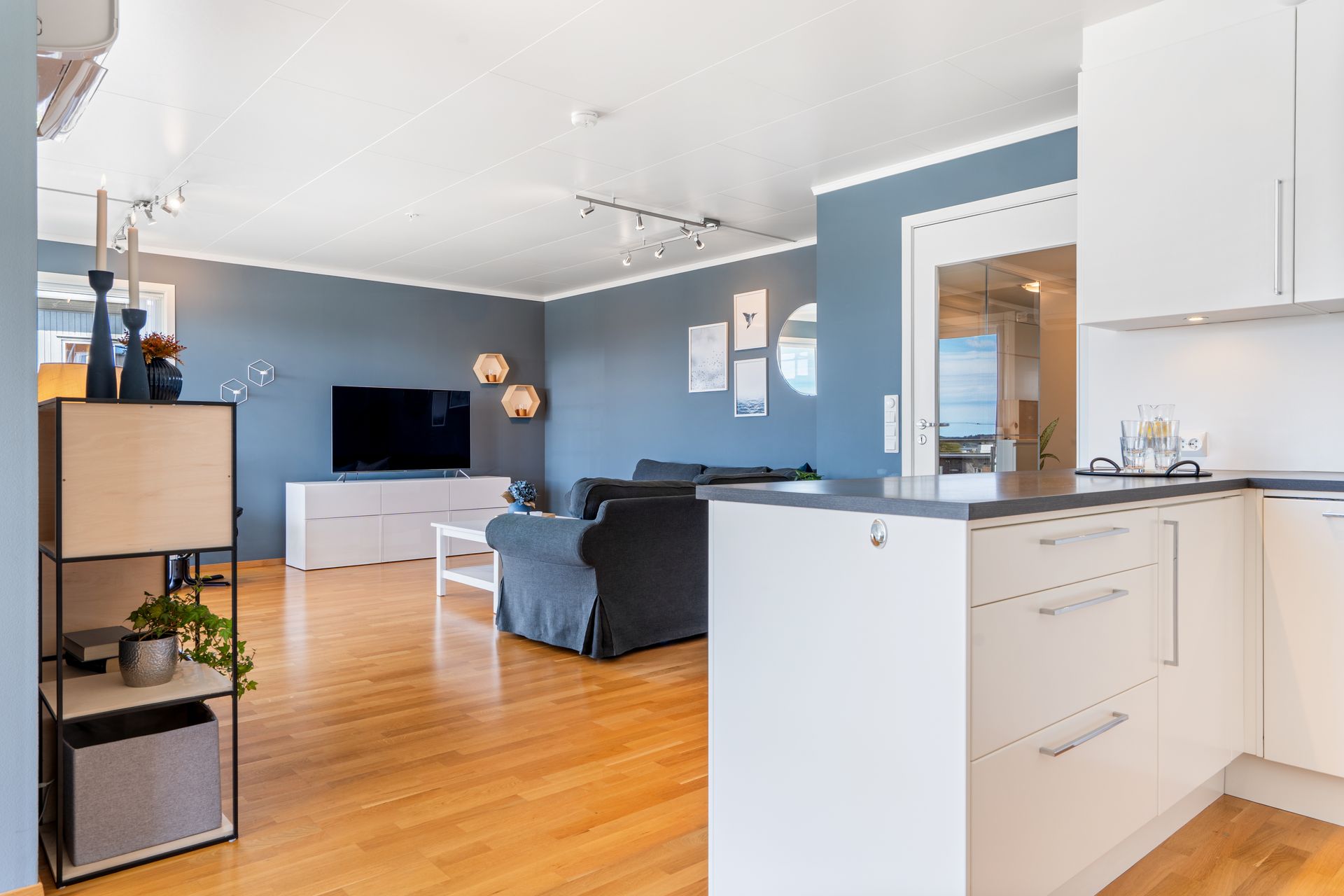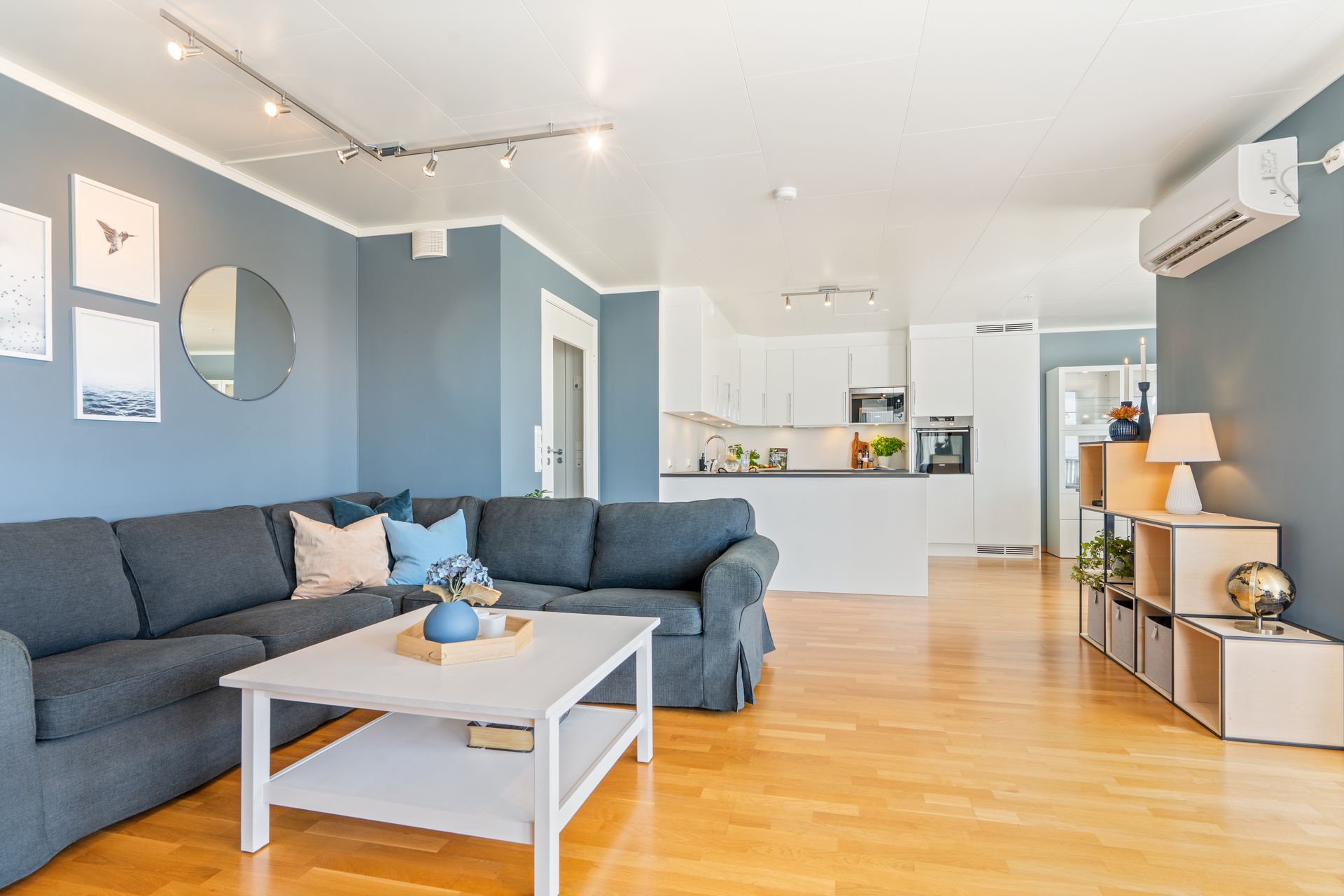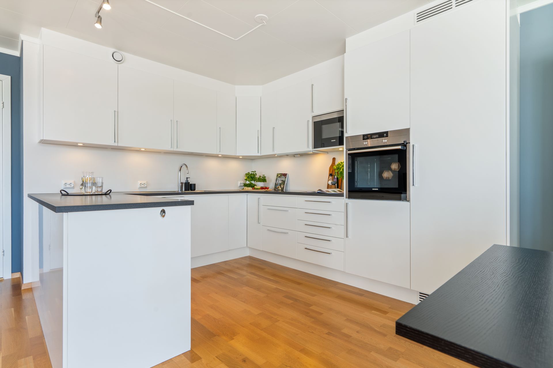 God standard med flott flislagt bad, utvidet kjøkkeninnredning m/integrerte hvitevarer, parkett på gulv og tiltalende terrasse m/le for nordavind. Varmepumpe og balansert ventilasjonssystem.