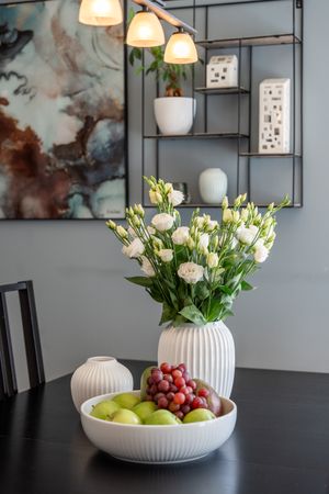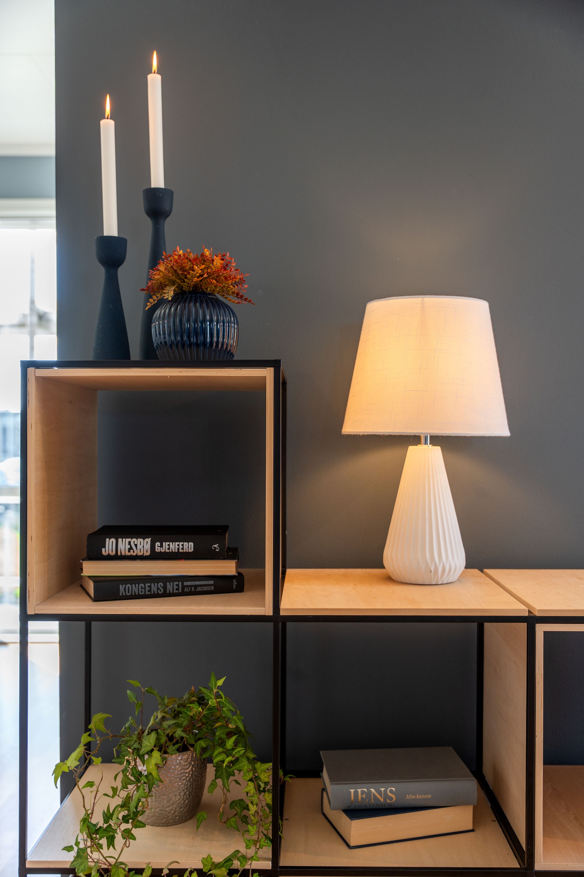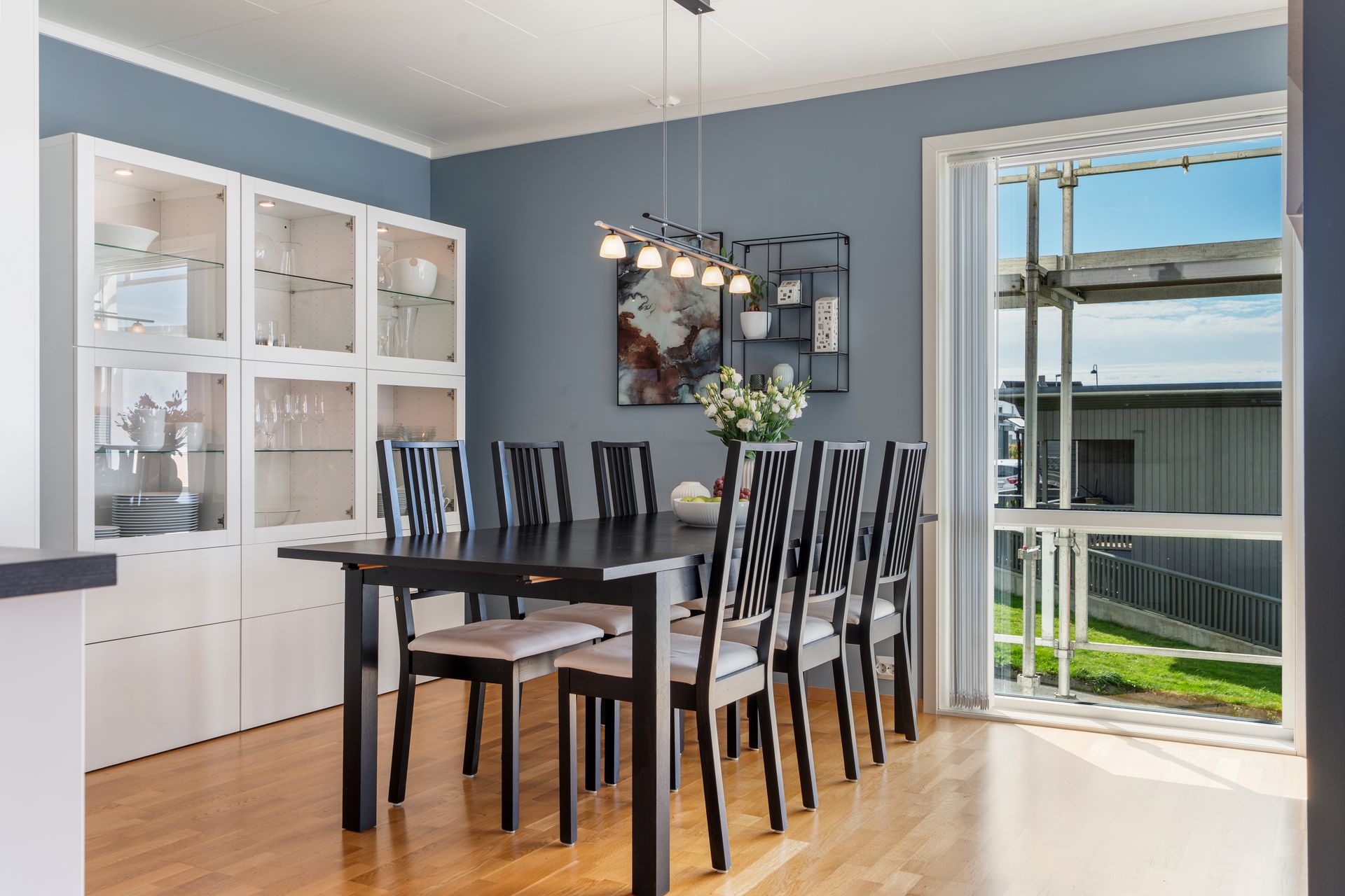 Selger opplyser om at skap på vegg på hovedsoverom og diverse trådkurver samt lampe over spisebord ikke medfølger handelen.