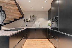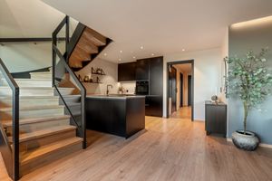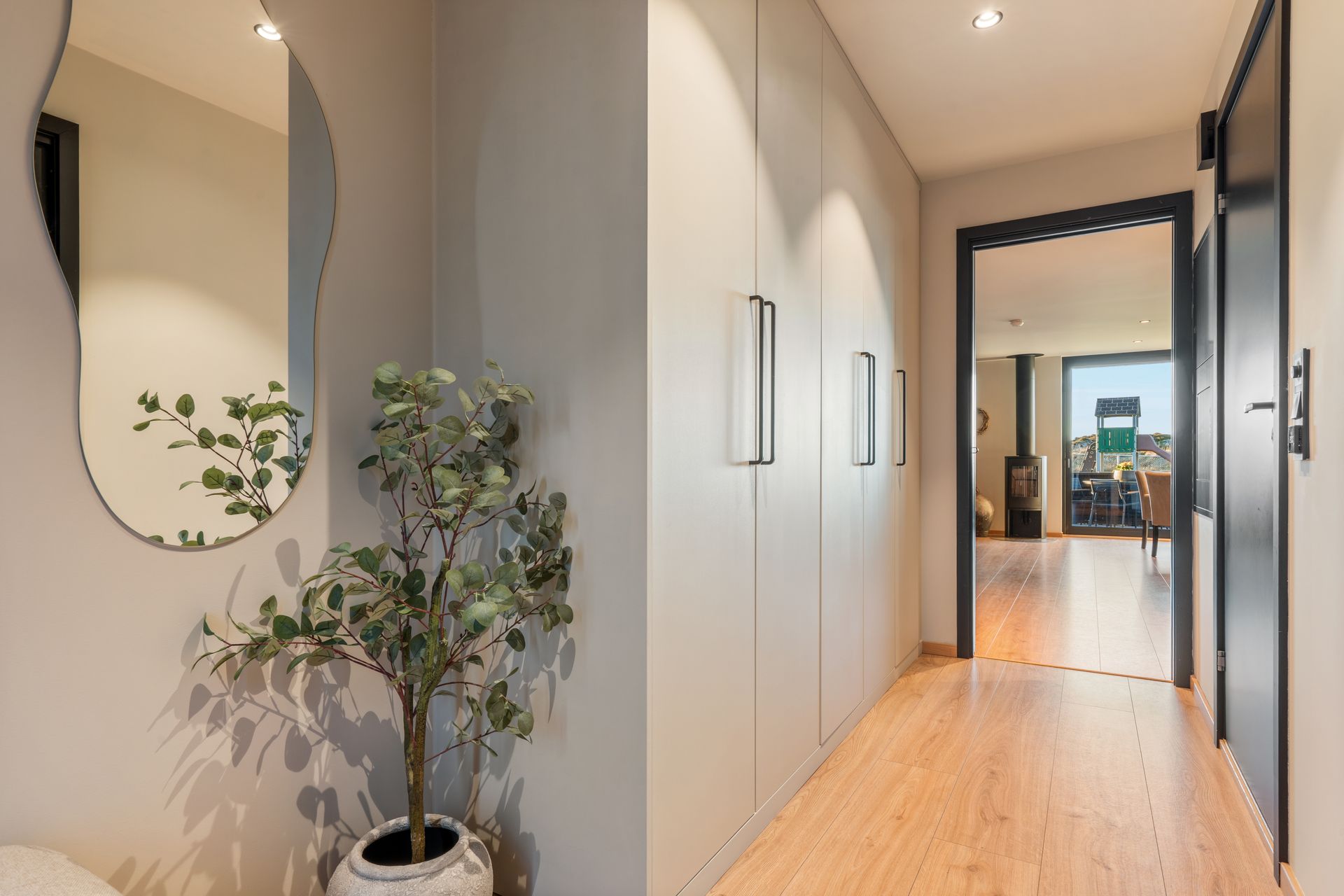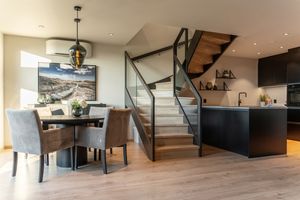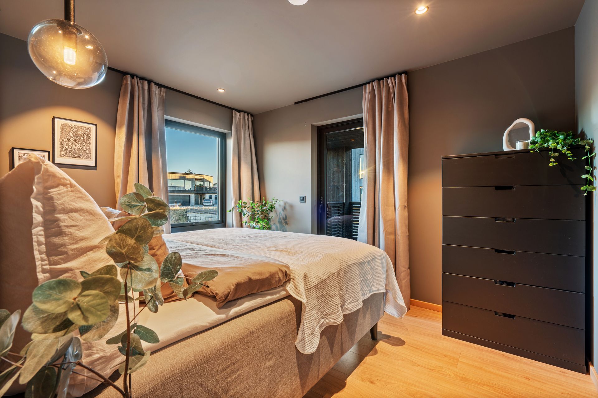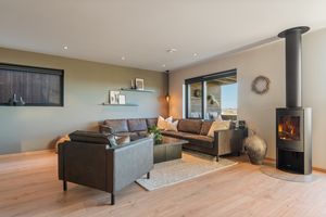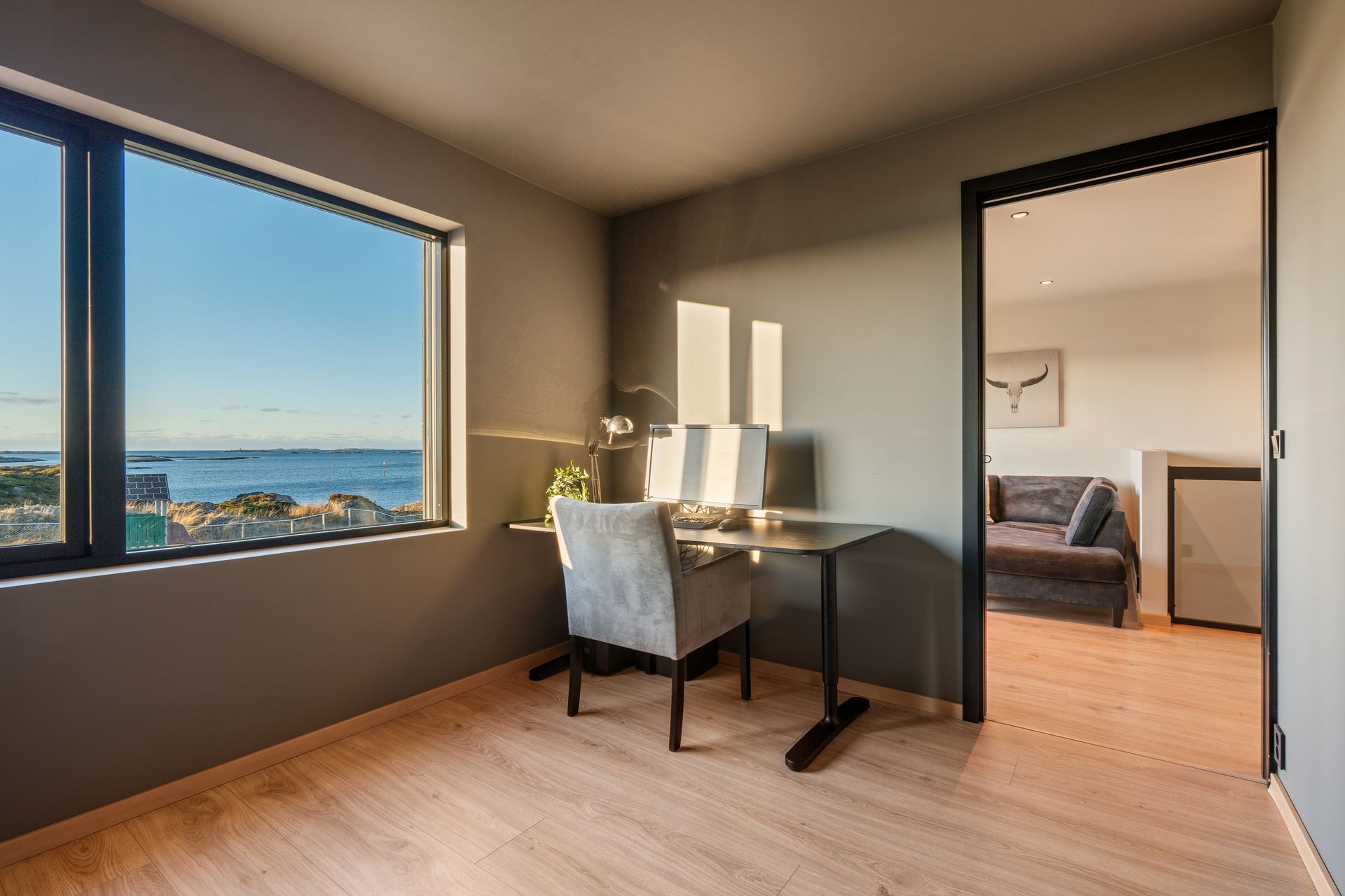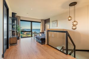 Første etasje: -Oppgraderte gulv i hele boligen. Moderne en-stavs laminatgulv. -Oppgradert med utvendig solskjerming (vinduer mot sør i første og andre etasje). Svært praktisk å benytte på solrike dager. Ellers er det montert plissegardiner i flere vinduer. -2 helflisede baderom av høy kvalitet med 60x60 fliser og varmekabler. Bad i første etasje inneholder et moderne dusjhjørne med sorte detaljer og mosaikk fliser på gulv i dusjsonen. Vegghengt toalett, moderne speil med led bakgrunn`s belysning og ellers sorte detaljer på stikkontakt, servant, håndtak til baderomsmøbel, lampe, "flush" knapp til toalett og downlights. Badet i andre etasje inneholder samme fliser og løsning i dusjsonen som i første etasje. Noe større baderomsmøbel og speil i samme stil som første etasje. Her er det også et herlig badekar og vegghengt toalett. -Stue/kjøkken i åpen løsning. Oppgradert kjøkkeninnredning fra Friestad med integrerte hvitevarer og en nydelig laminat benkeplate med steinmønster. Høy kvalitet med bla. platetopp med integrert ventilator, komfyr i praktisk høyde, høyskap, særdeles god oppbevaring i innredning + øy/utstikker, uttrekkbar vask, og hallglans fronter som gjør vaskejobben enkel. Oppgradert belysning med rikelig med downlights i forskjellige soner. Moderne varmepumpe som passer perfekt inn i interiøret og en svært koselig vedovn som bidrar til en herlig atmosfære. I tillegg er det installert en spesiallaget trapp som fremstår som et svært flott møbel i boligen, med sorte detaljer og glassfasade. Glassfasaden i trapperekkverket bidrar til at du får den flotte sjøutsikten mens du koser deg med matlaging. God plass til spisebord og sofa i tv-sonen. Moderne led strip belysning over tv mot himling - gir en eksklusiv følelse. -Entrè med innebygd pax garderobe løsning. -Eget vaskerom med flislagt gulv. Innredet med praktisk benkeplate.