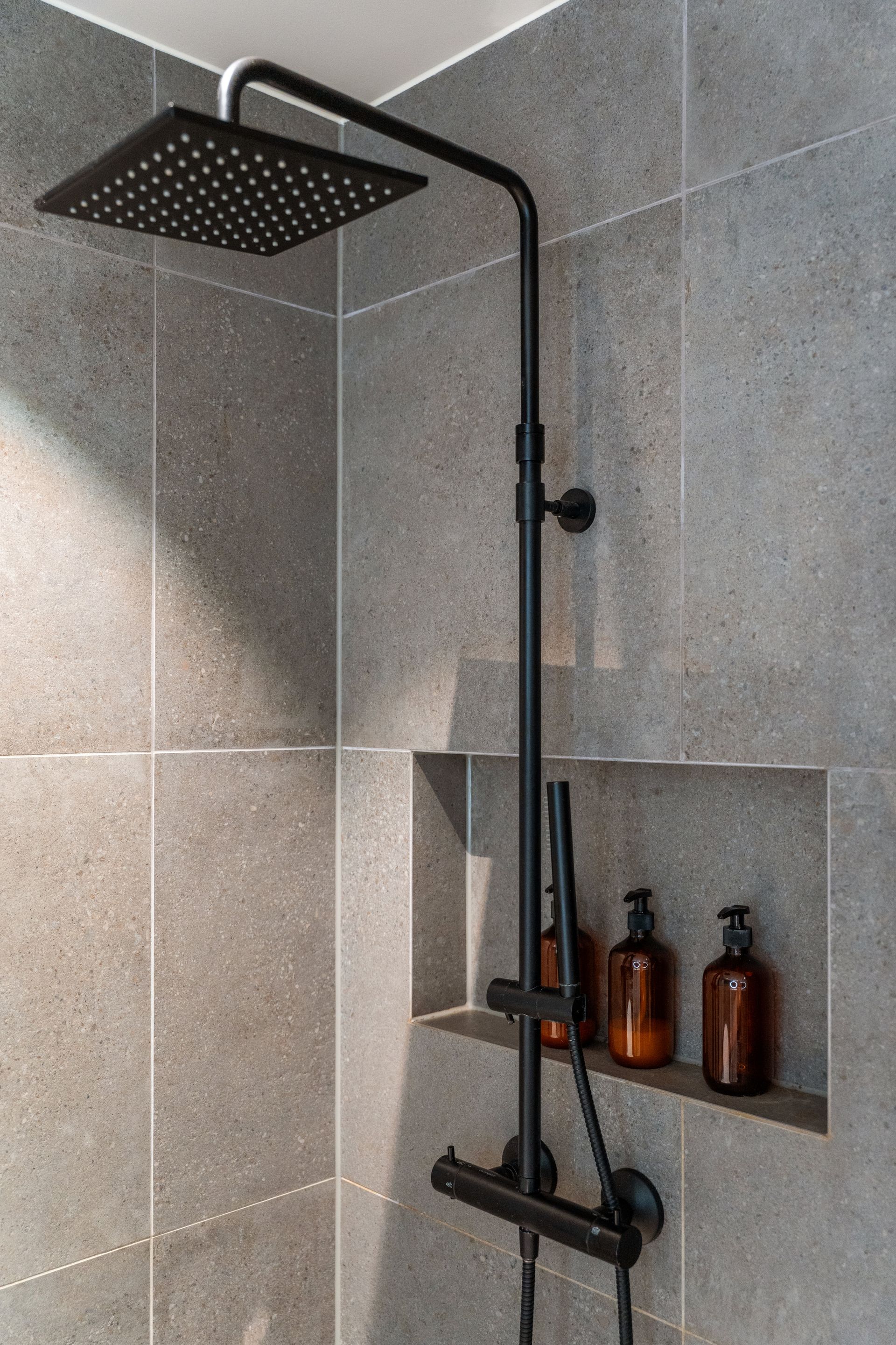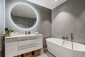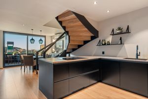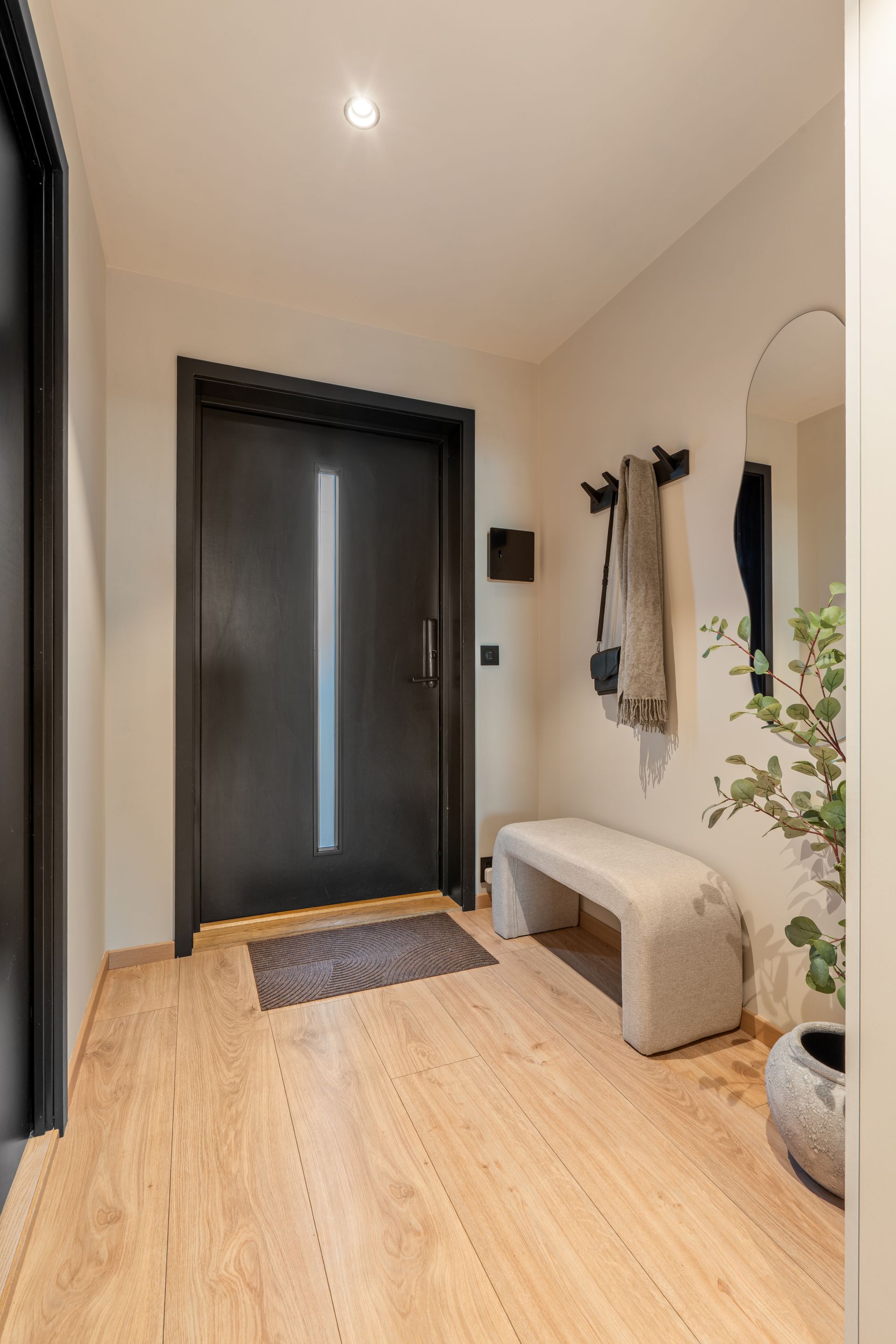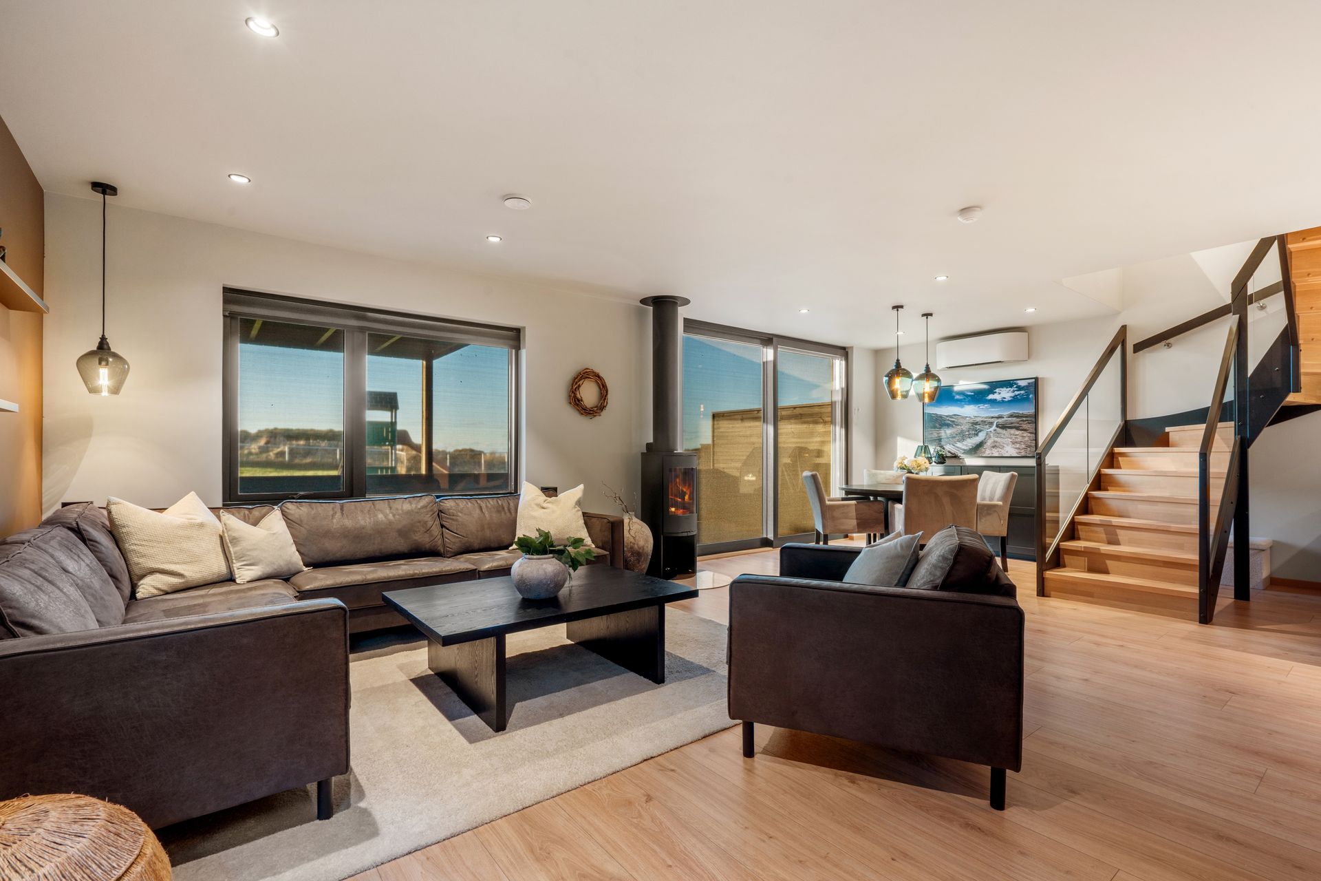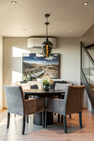 Første etasje: -Oppgraderte gulv i hele boligen. Moderne en-stavs laminatgulv. -Oppgradert med utvendig solskjerming (vinduer mot sør i første og andre etasje). Svært praktisk å benytte på solrike dager. Ellers er det montert plissegardiner i flere vinduer. -2 helflisede baderom av høy kvalitet med 60x60 fliser og varmekabler. Bad i første etasje inneholder et moderne dusjhjørne med sorte detaljer og mosaikk fliser på gulv i dusjsonen. Vegghengt toalett, moderne speil med led bakgrunn`s belysning og ellers sorte detaljer på stikkontakt, servant, håndtak til baderomsmøbel, lampe, "flush" knapp til toalett og downlights. Badet i andre etasje inneholder samme fliser og løsning i dusjsonen som i første etasje. Noe større baderomsmøbel og speil i samme stil som første etasje. Her er det også et herlig badekar og vegghengt toalett. -Stue/kjøkken i åpen løsning. Oppgradert kjøkkeninnredning fra Friestad med integrerte hvitevarer og en nydelig laminat benkeplate med steinmønster. Høy kvalitet med bla. platetopp med integrert ventilator, komfyr i praktisk høyde, høyskap, særdeles god oppbevaring i innredning + øy/utstikker, uttrekkbar vask, og hallglans fronter som gjør vaskejobben enkel. Oppgradert belysning med rikelig med downlights i forskjellige soner. Moderne varmepumpe som passer perfekt inn i interiøret og en svært koselig vedovn som bidrar til en herlig atmosfære. I tillegg er det installert en spesiallaget trapp som fremstår som et svært flott møbel i boligen, med sorte detaljer og glassfasade. Glassfasaden i trapperekkverket bidrar til at du får den flotte sjøutsikten mens du koser deg med matlaging. God plass til spisebord og sofa i tv-sonen. Moderne led strip belysning over tv mot himling - gir en eksklusiv følelse. -Entrè med innebygd pax garderobe løsning. -Eget vaskerom med flislagt gulv. Innredet med praktisk benkeplate.