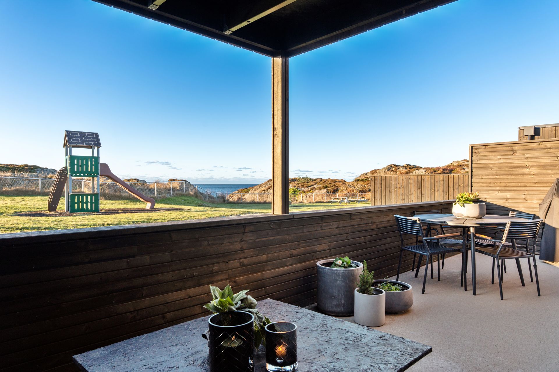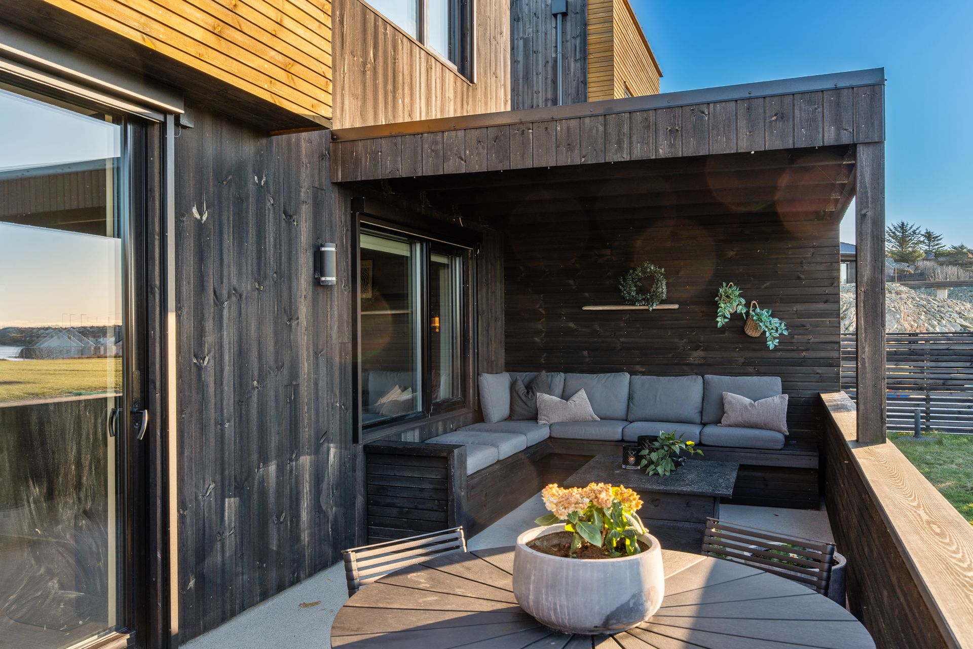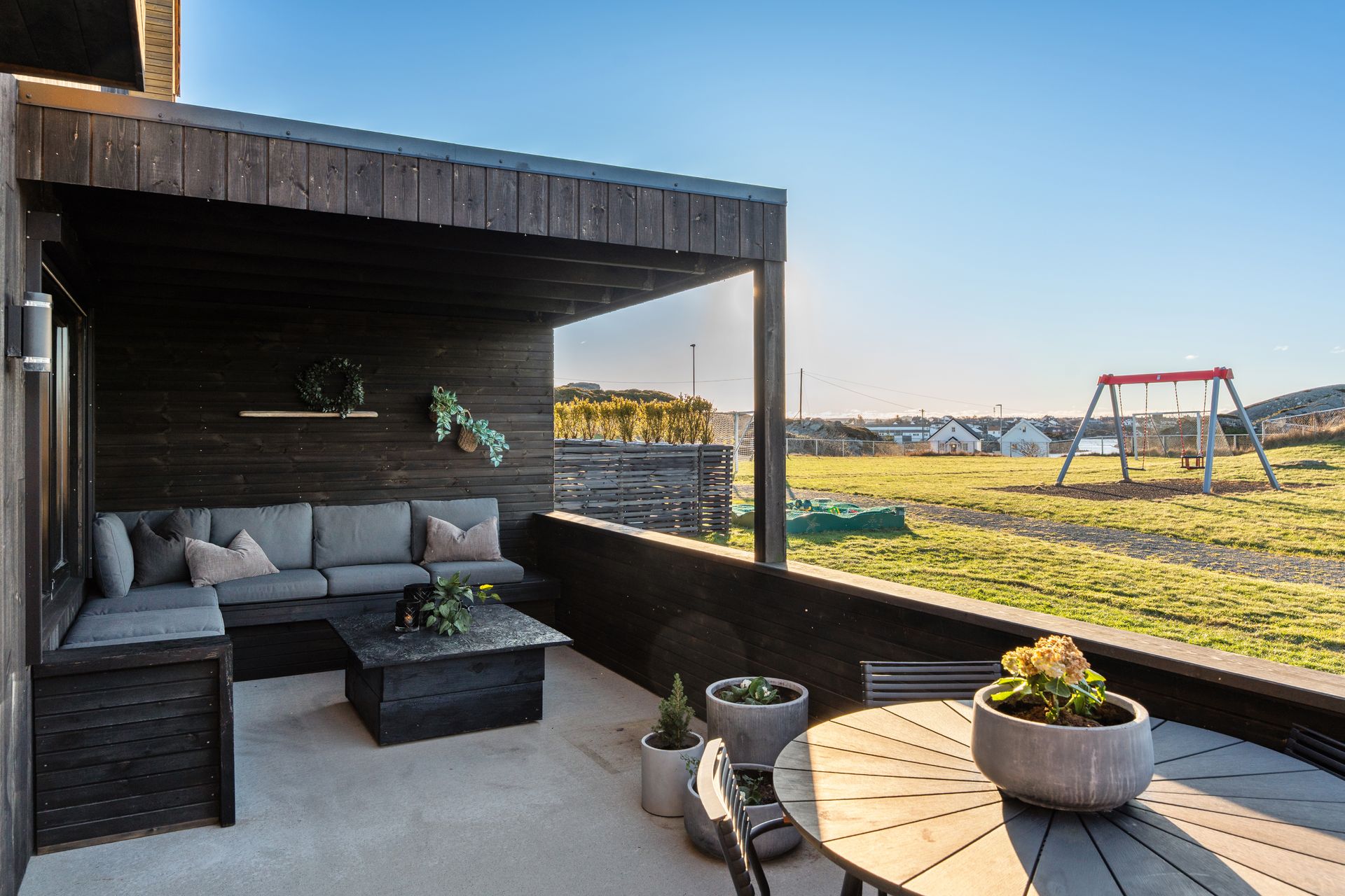 -Utvendig: -Carport, el-bil lader, utvendig bod, asfaltert gardstun, utvendig led strip belysning vertikalt langs fasaden i inngangsparti (montert selv av eier). Terrasse med tilkomst fra uteområdet eller via stuen. Støpt dekke og deler av terrassen har overbygg (Pergola). Rekkverk i samme stil som boligen, samt "levegg" som skjermer mot naboen i vest. Pergola/levegg er ikke omsøkt godkjent i kommunen.