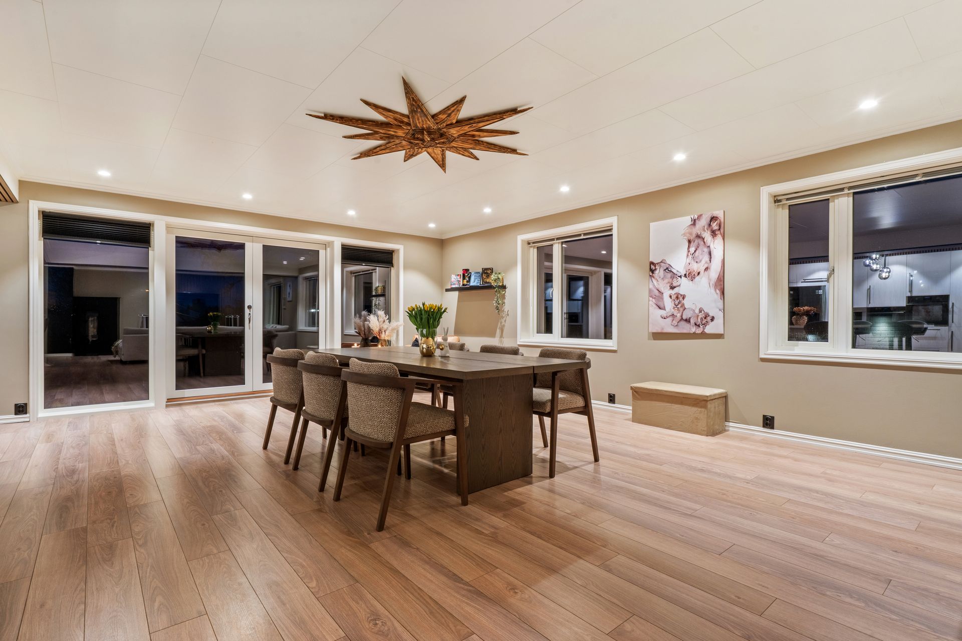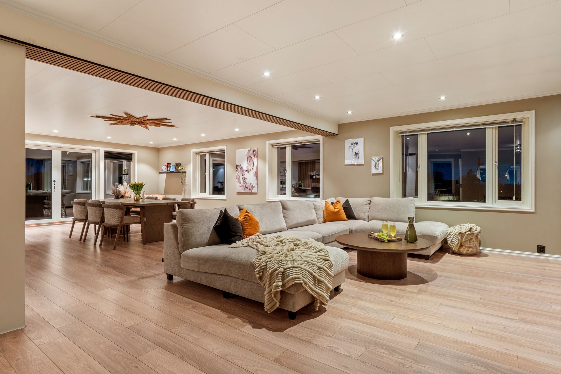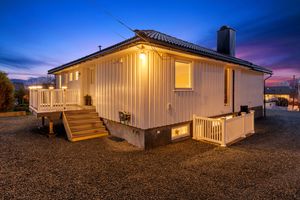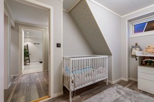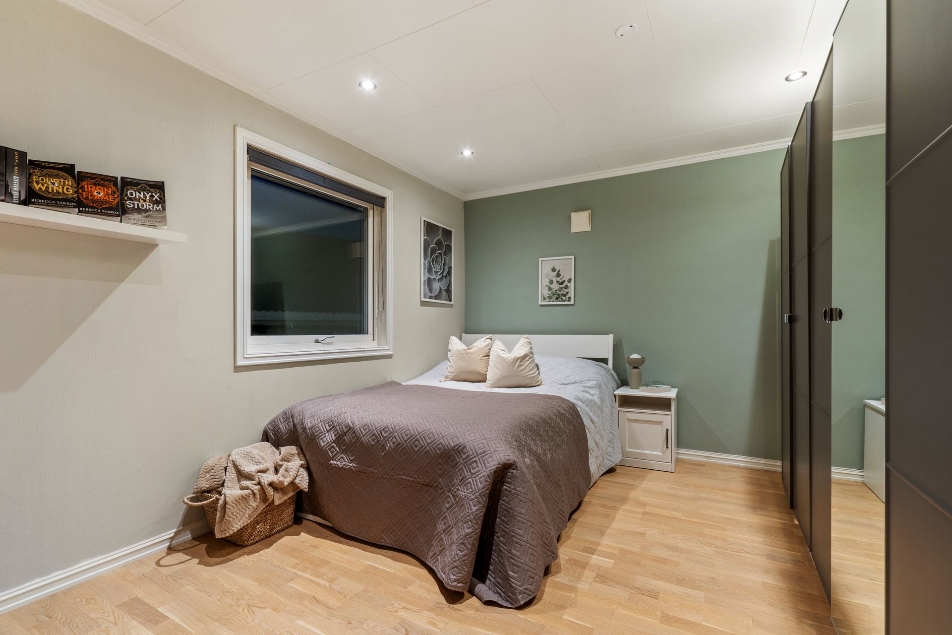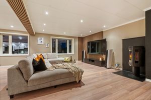Innvendig: Hovedetasje: - Romslig entrè/gang oppusset med ny maling og montert spileplater for et moderne uttrykk. - Gjestesoverom/oppbevaringsrom holder eldre standard. - Svært romslig og kjekk åpen stue/kjøkken (ca. 91 m2) løsning med god plass til venner og familie på besøk. Samtidig en herlig boltreplass i hverdagen. Dagens eiere beskriver rommet som svært kjekt. Noen nye spotter i stue/kjøkken, samt ny verandadør, nye sorte stikk og dimmere. Montert spileplater ved kjøkkeninnredningen og ellers deler av stuen som gir et eksklusivt uttrykk. - Pent baderom med fliser på gulv og baderomspanel på vegg. Varmekabler i gulv og downlights belysning. Badet inneholder vegghengt toalett, servantskap, høyskap for oppbevaring, samt dusjkabinett. - Romslig soverom med god garderobeplass. Downlights belysning. - Nylig i mars ble trappenedgangen til kjeller helsparklet og malt.