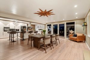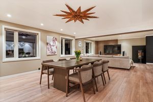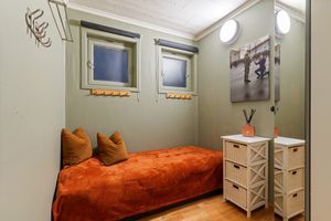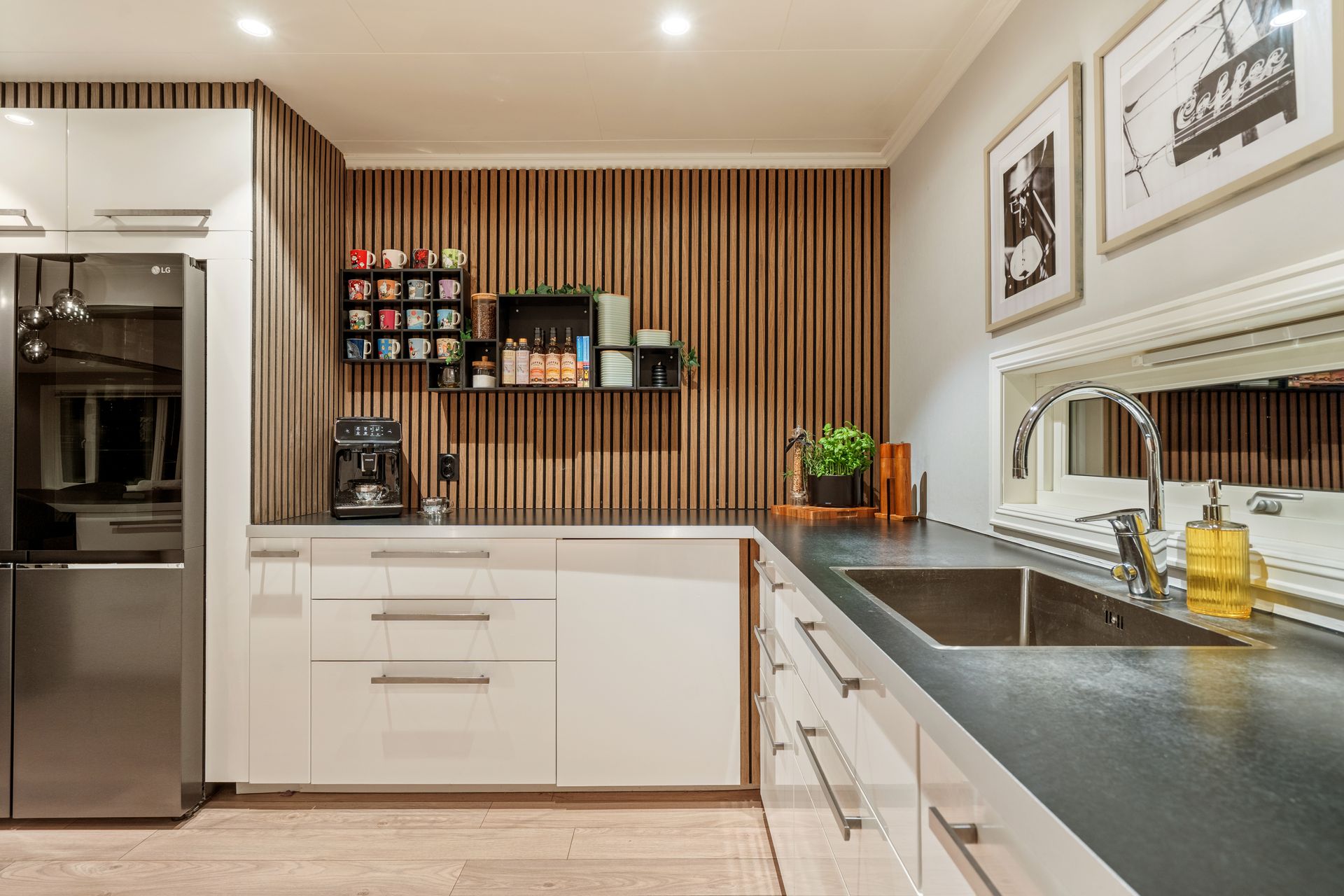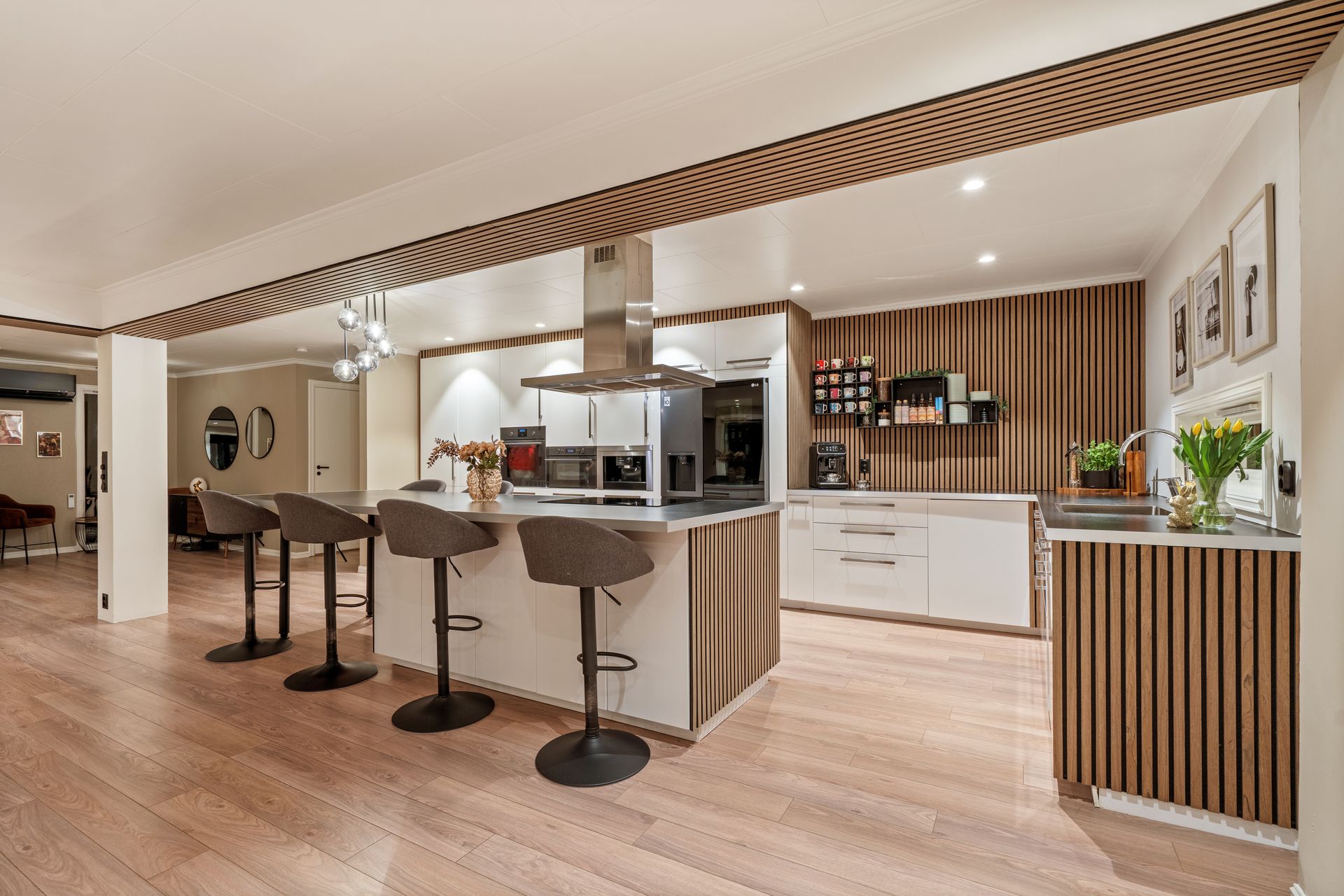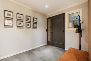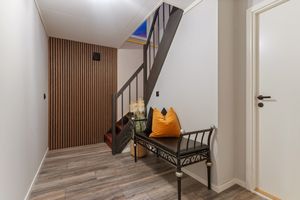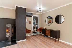 Innvendig: Hovedetasje: - Romslig entrè/gang oppusset med ny maling og montert spileplater for et moderne uttrykk. - Gjestesoverom/oppbevaringsrom holder eldre standard. - Svært romslig og kjekk åpen stue/kjøkken (ca. 91 m2) løsning med god plass til venner og familie på besøk. Samtidig en herlig boltreplass i hverdagen. Dagens eiere beskriver rommet som svært kjekt. Noen nye spotter i stue/kjøkken, samt ny verandadør, nye sorte stikk og dimmere. Montert spileplater ved kjøkkeninnredningen og ellers deler av stuen som gir et eksklusivt uttrykk. - Pent baderom med fliser på gulv og baderomspanel på vegg. Varmekabler i gulv og downlights belysning. Badet inneholder vegghengt toalett, servantskap, høyskap for oppbevaring, samt dusjkabinett. - Romslig soverom med god garderobeplass. Downlights belysning. - Nylig i mars ble trappenedgangen til kjeller helsparklet og malt.