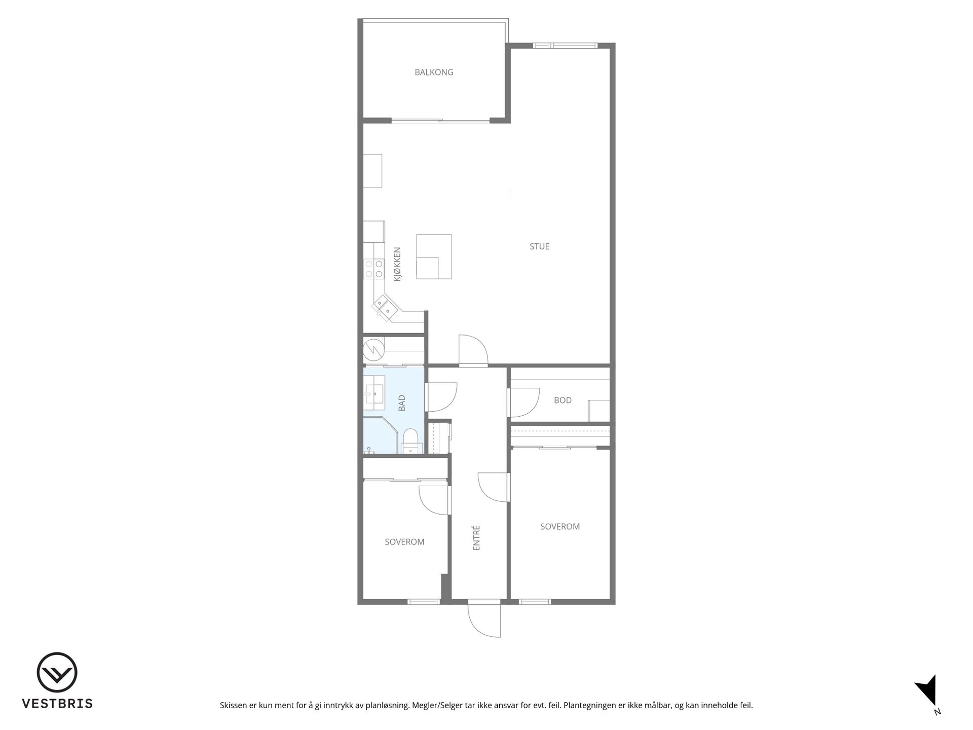 Leiligheten er innredet på et plan og inneholder: -Gang, 2 soverom, bod, bad, stue/kjøkken. -Balkong. -Privat parkering i garasjeanlegg og innvendig bod i garasjeanlegget.