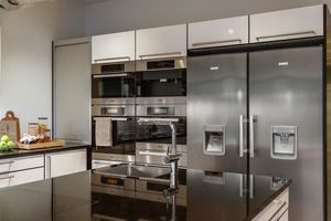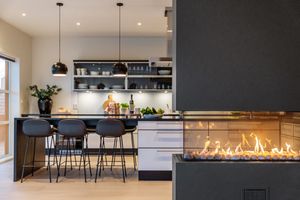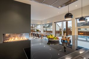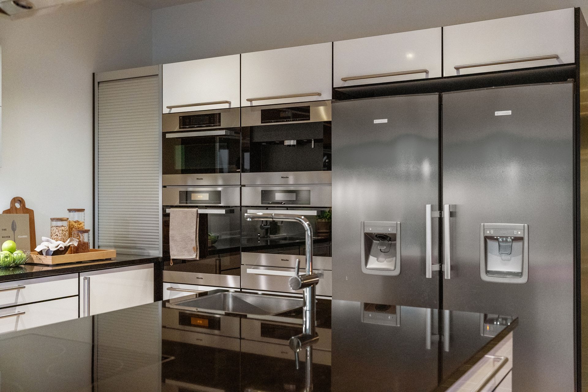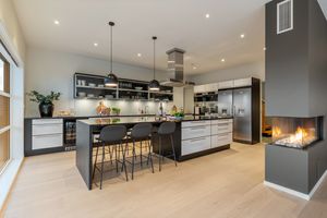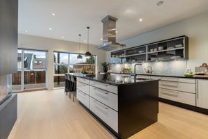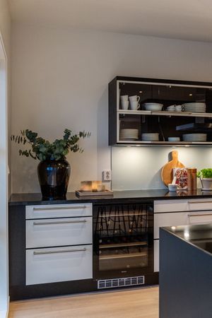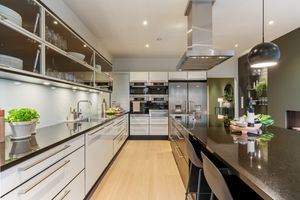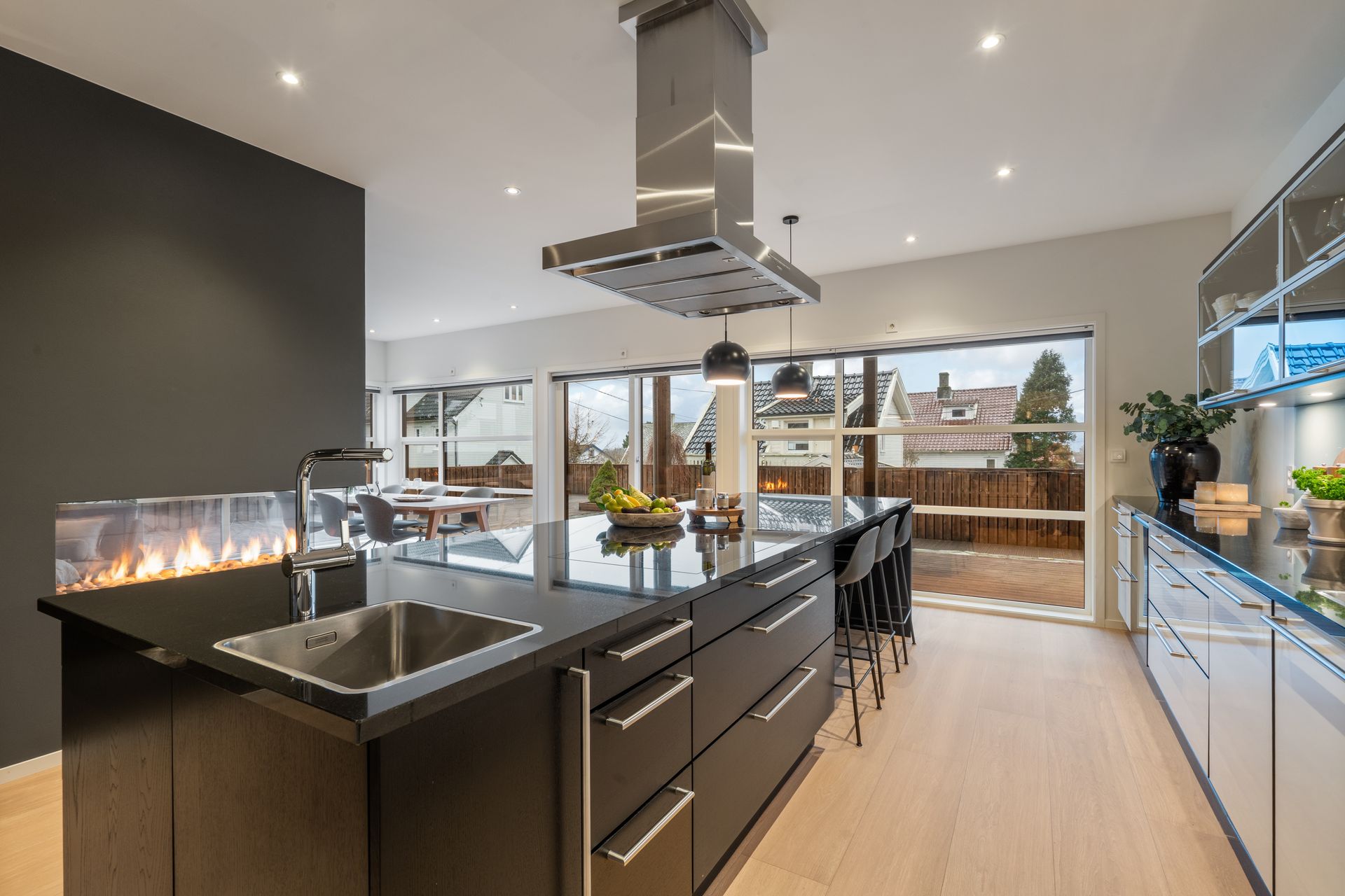Dekorativt og over gjennomsnitt utstyrt HTH-kjøkken og benkeplate i polert granitt. Platetopp og vask er planlimt i granittplaten for enklere renhold og penere design. Kjøkkenøy gir ekstra arbeidsplass og har spiseplass til 6 personer på enden. Det er montert en ekstra vask på kjøkken-øy, meget praktisk. Stekeovn med pyrolyse, mikroovn med stekefunksjoner, tallerkenvarmer til varme mat, heve deig etc. Kaffemaskin og dampovn med vanntilkobling. Ekstra bred platetopp og motorisert ventilator som heves/senkes. Innebygget vinskap. Alt levert av Miele. Kjøleskap og fryseskap fra Electrolux med vann- og isdispenser. Rikelig med stikkontakter.
