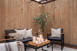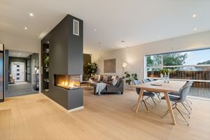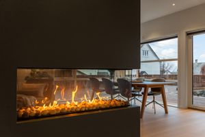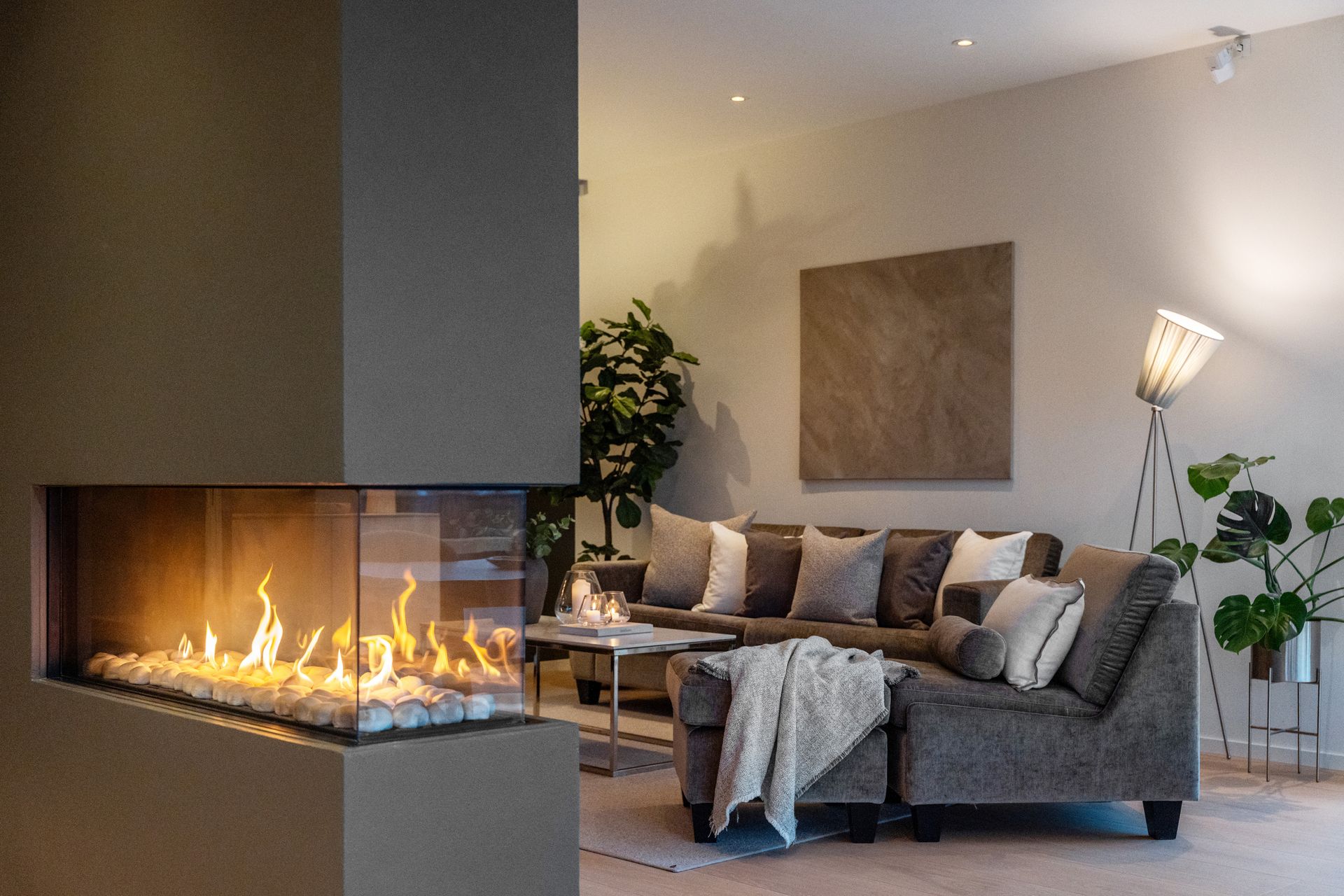 Stue og kjøkkensone med parkett på gulv. Gasspeis som deler av stue og kjøkkensonen. Downlights. Solskjerming i vinduer samt stikk til å henge opp julepynt i alle vinduene mot vest.