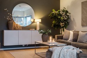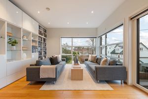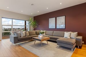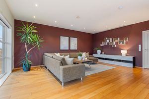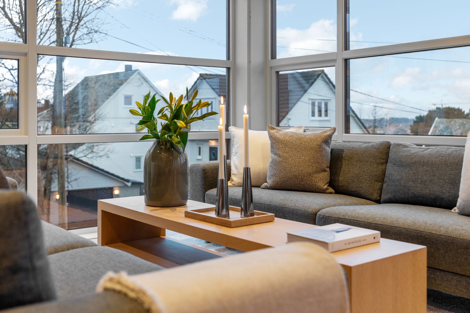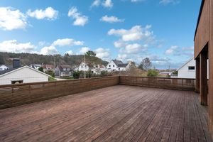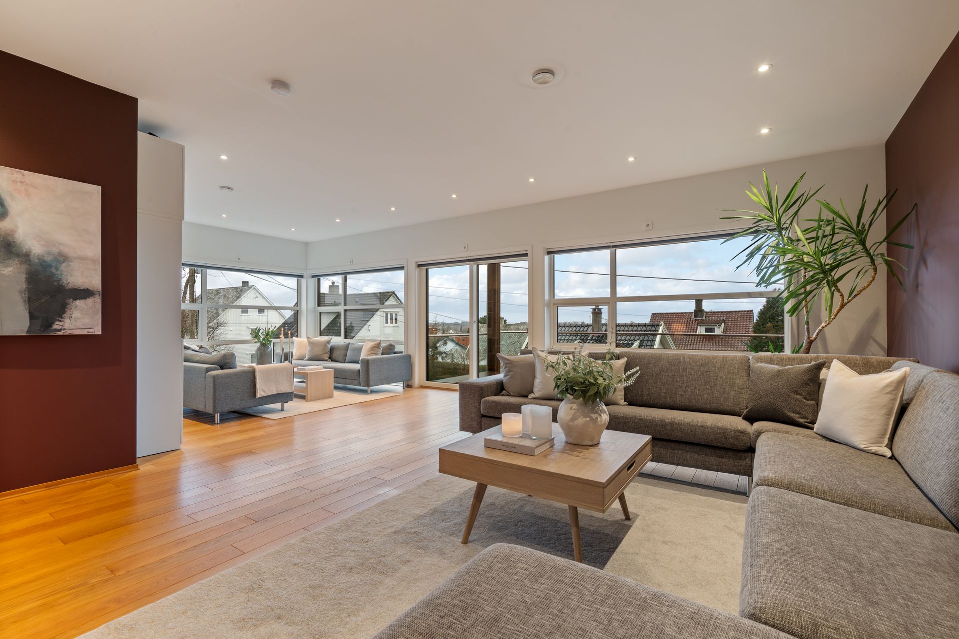 Stor stue med heltre eikeparkett. Store glassflater og flott utsyn. Utgang til 18 kvm terrasse med flott utsikt mot nærområdet/byen.