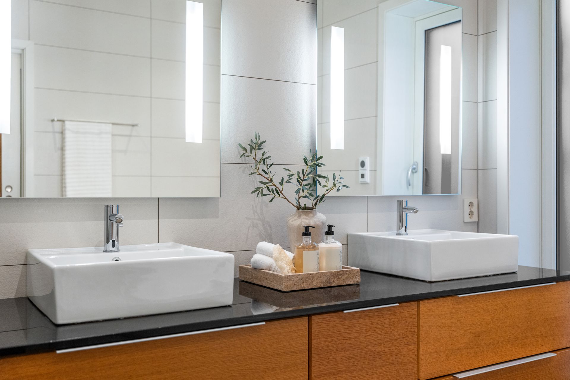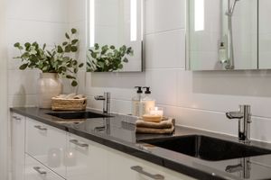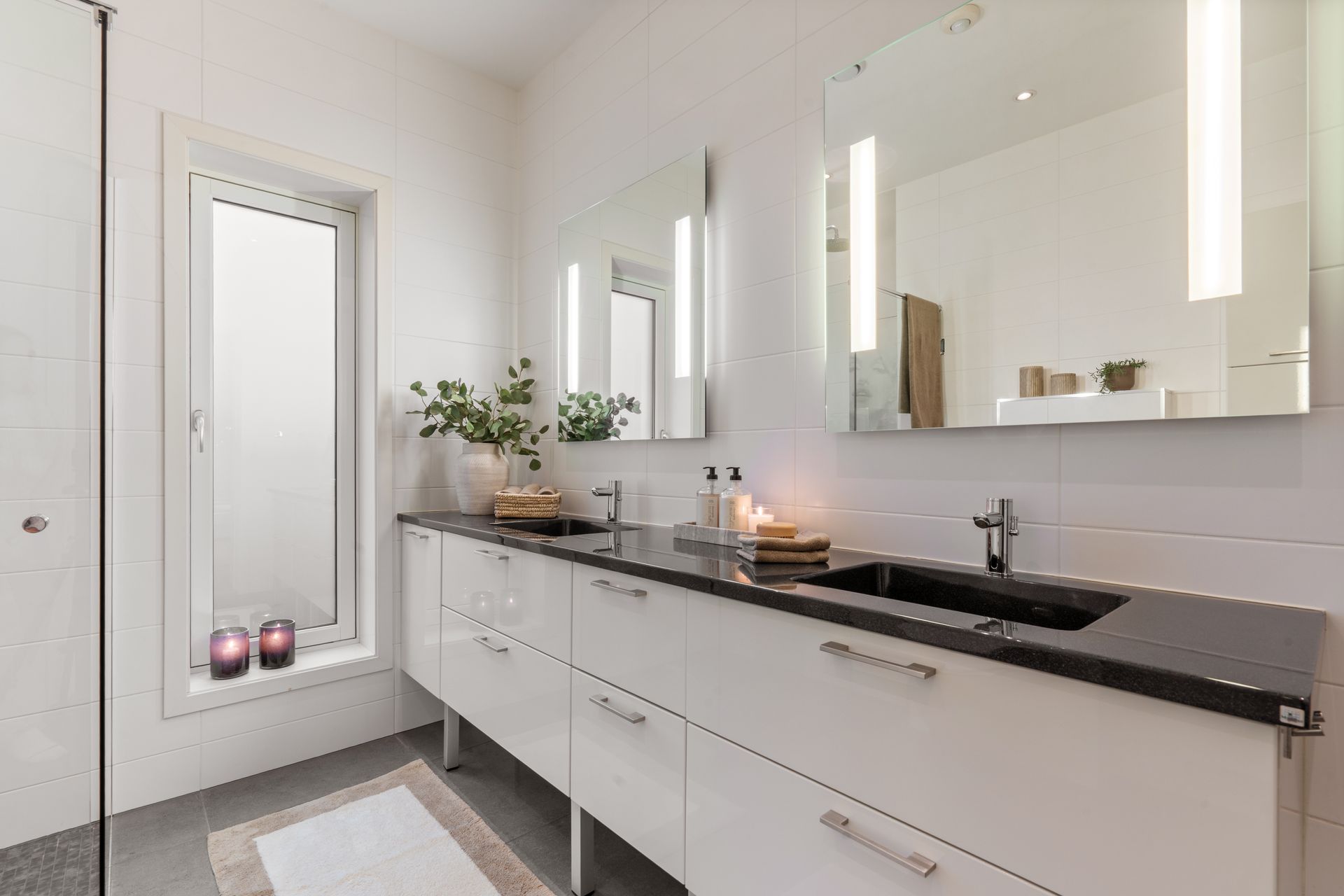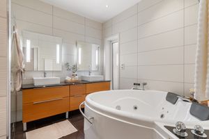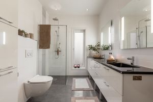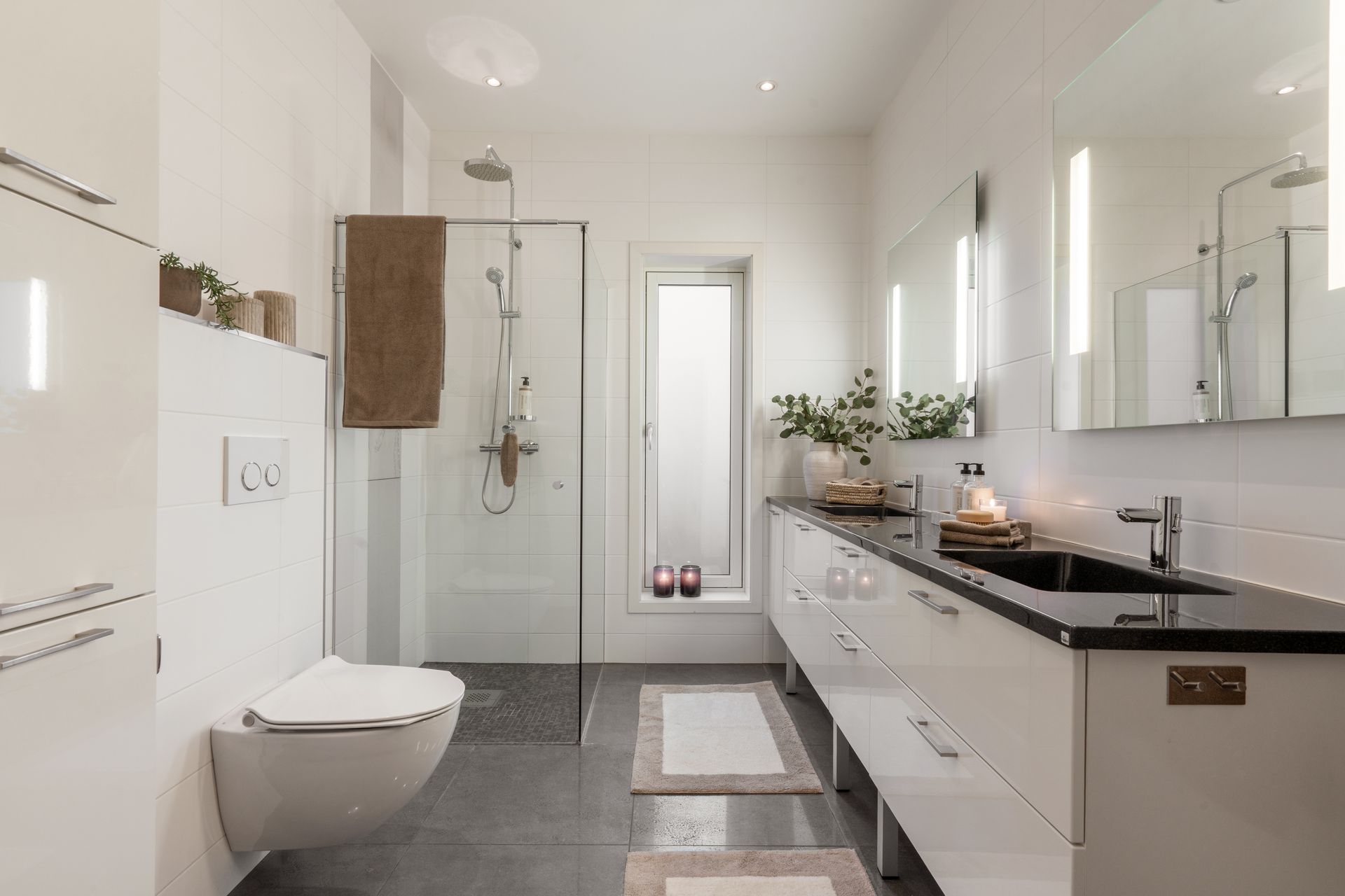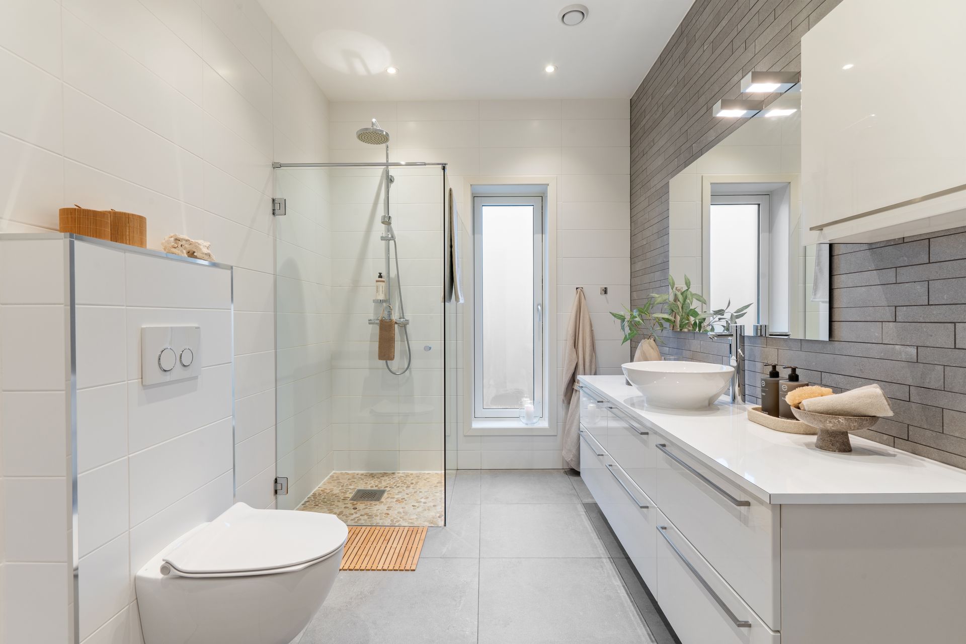 Badet i 2. etasje holder samme høye standard som boligens øvrige 2 bad. Stor HTH innredning med dobbel vask. Flisbelagte gulv og vegger. Dusjnisje med glassvegg. Downlights og vannbåren gulvvarme.