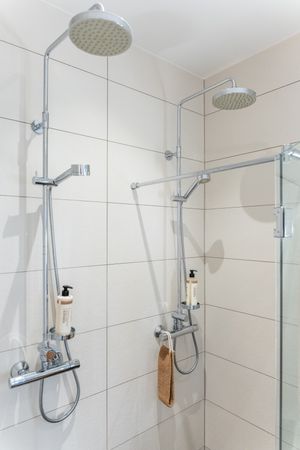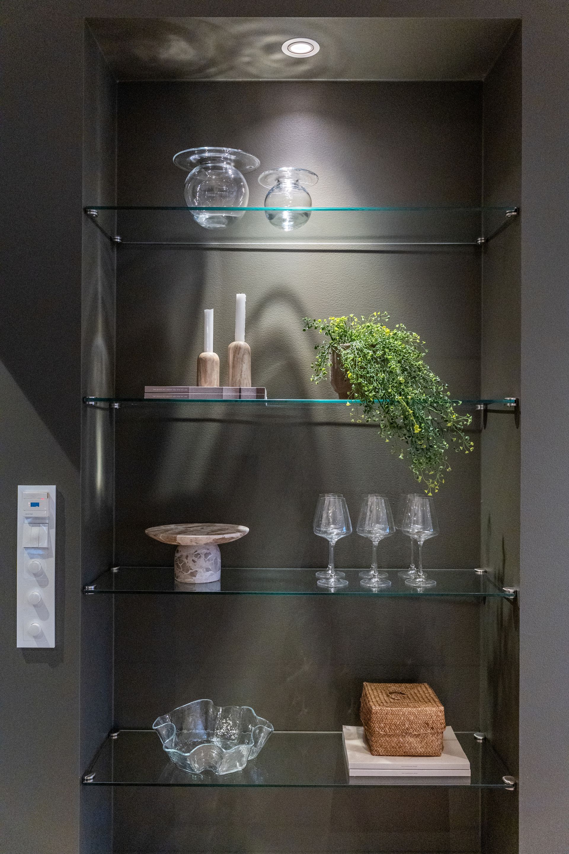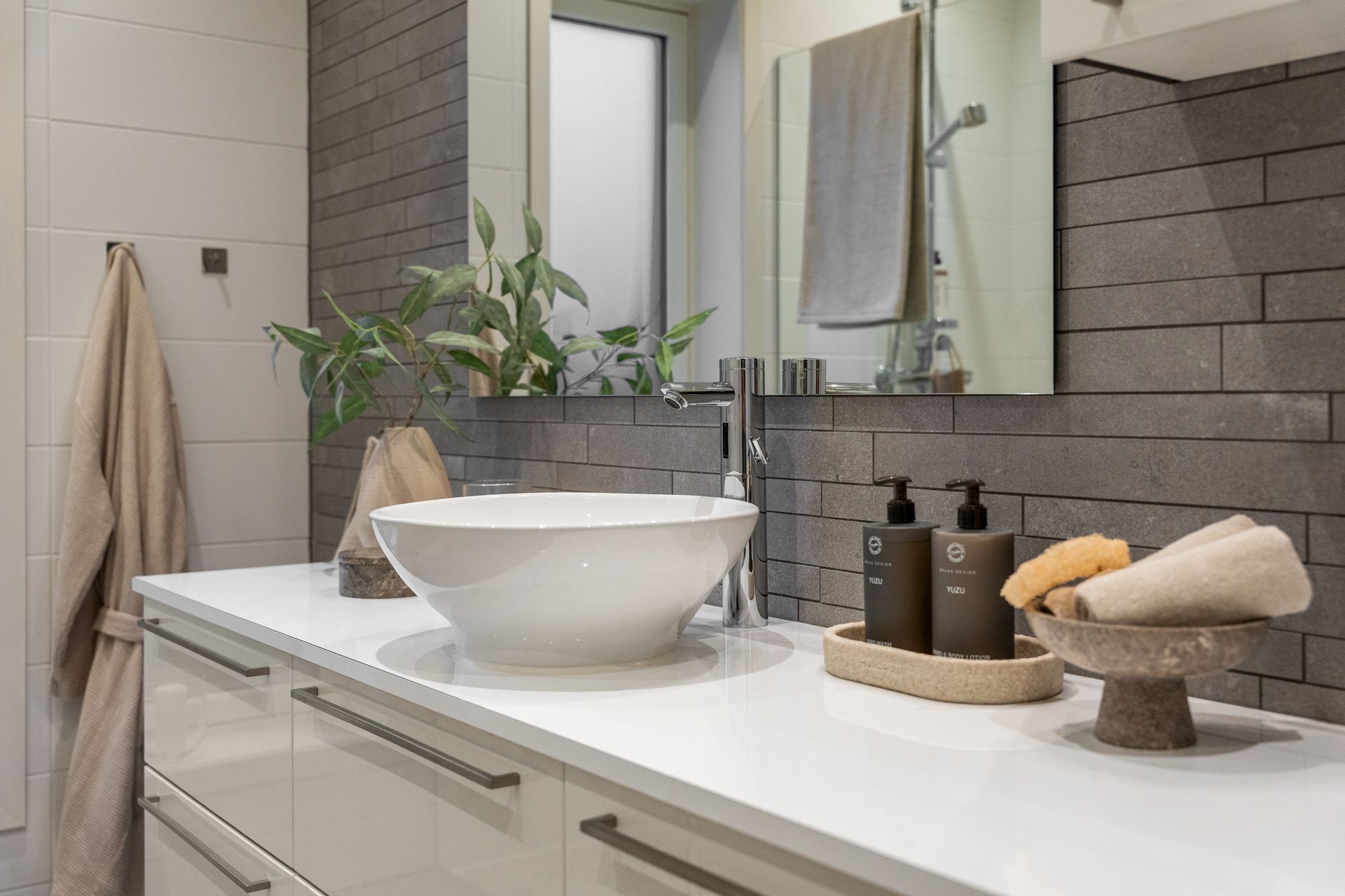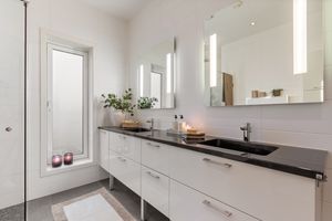Helfliset gjestebad med høy standard. Dusj-løsning med glassvegg, elvesteins-gulv og dekorativt dusj-garnityr. Stor seksjon fra HTH med bolle-servant på benkeplate. Sensorstyrt blandebatteri fra Iqua. Downlights.