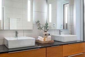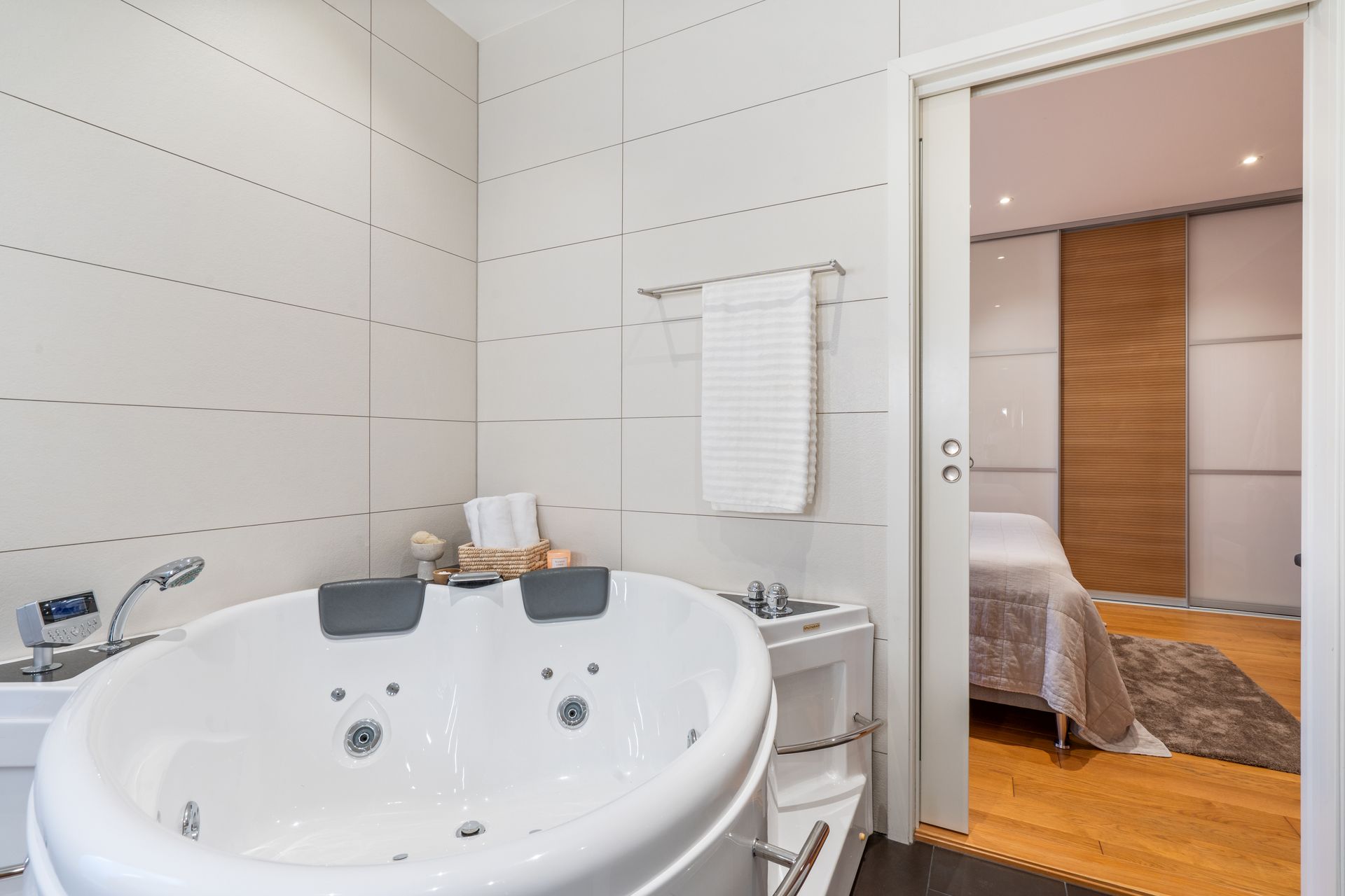 Badet tilknyttet foreldresoverom er helfliset, vegghengt wc, dobbel dusjnisje med glassvegger og dobbel dusjgarnityr fra Damixa. Boblekar med luft og vann-massasjefunksjon. Dobbel seksjon fra HTH, polert granittplate med 2 servanter. Sensorstyrte blandebatterier. Innebygget radio i bryter-armatur.