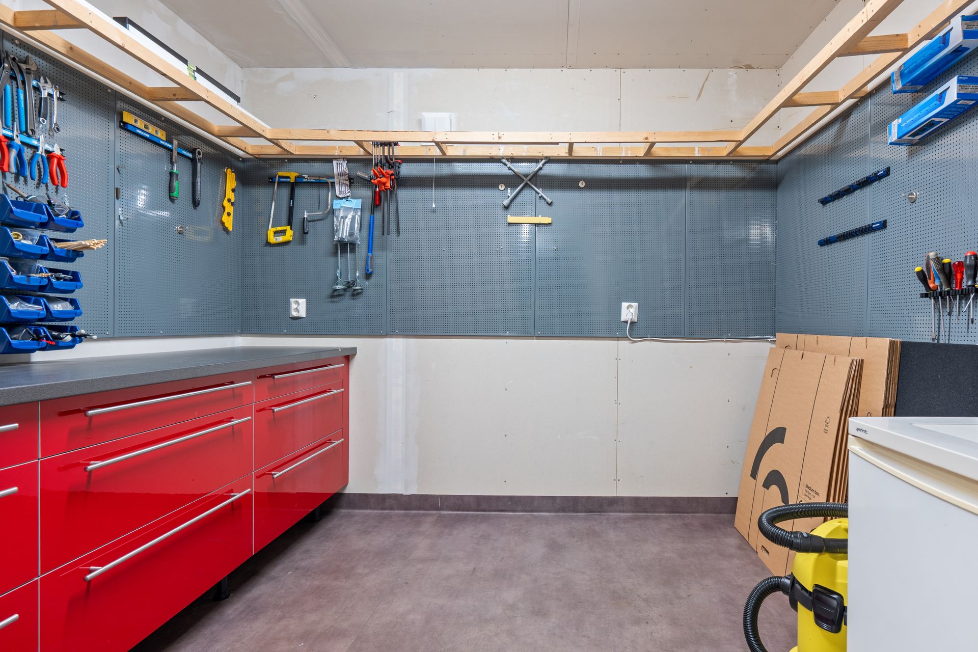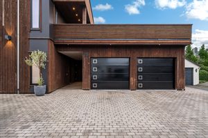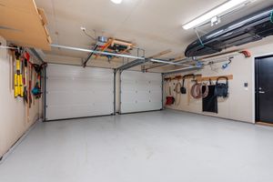 Dobbel garasje har 2 Hørmann garasjeporter med elektrisk åpner. Garasjen er isolert og platet på innsiden. Det er avdelt eget arbeidsrom med innredning til verktøy/utstyr.