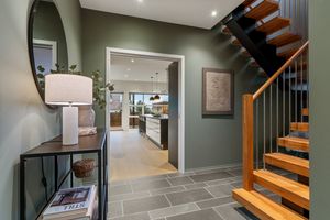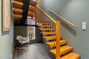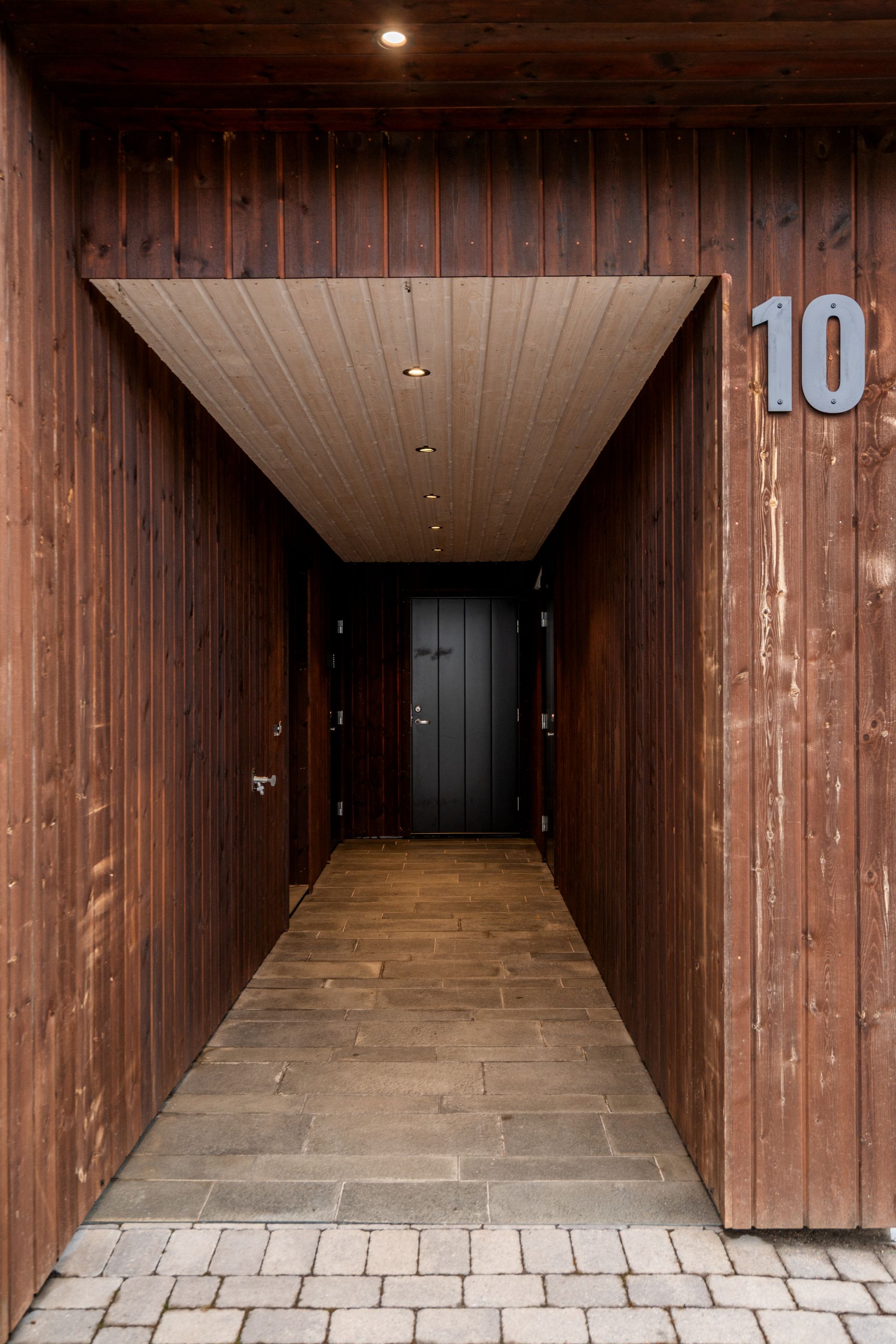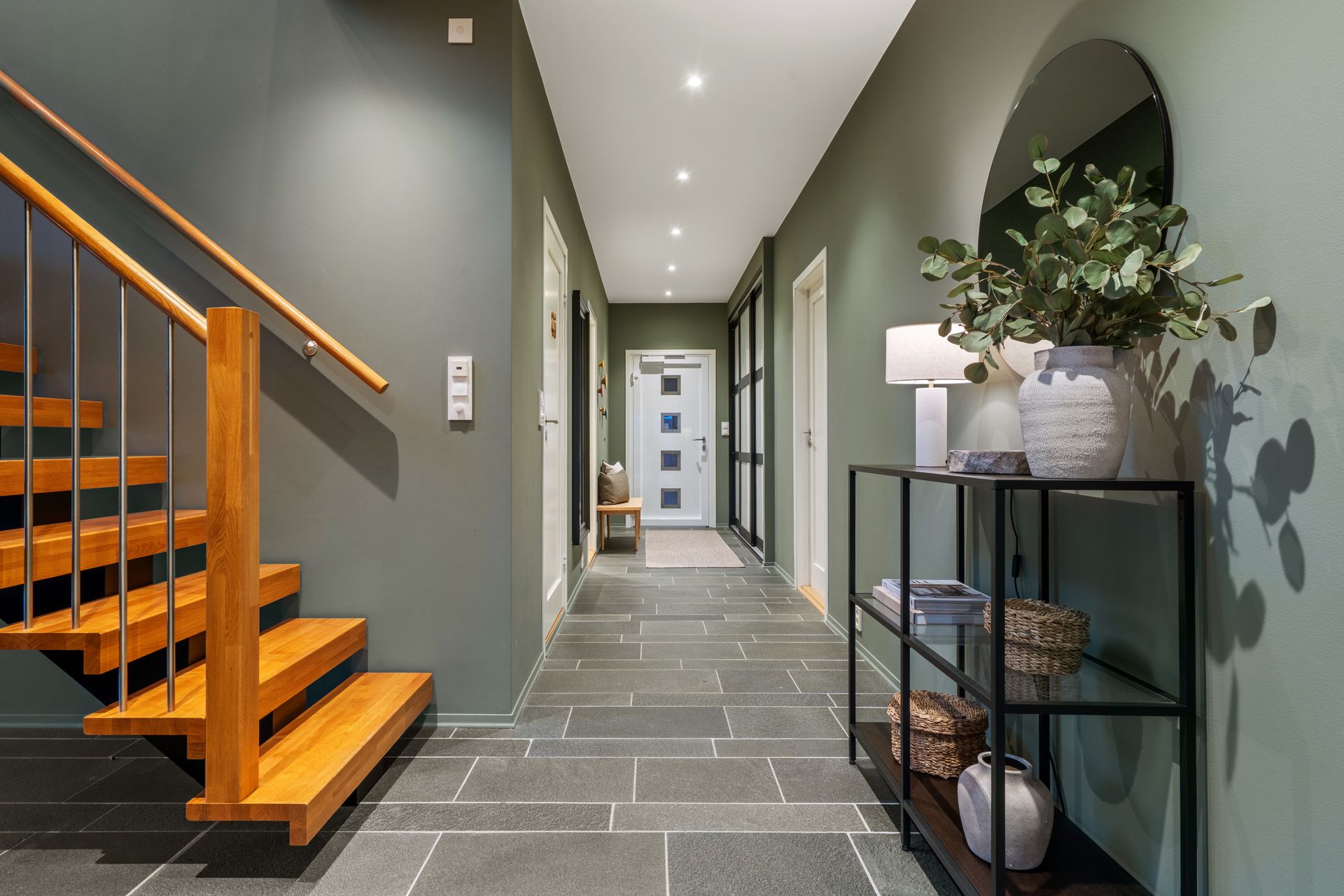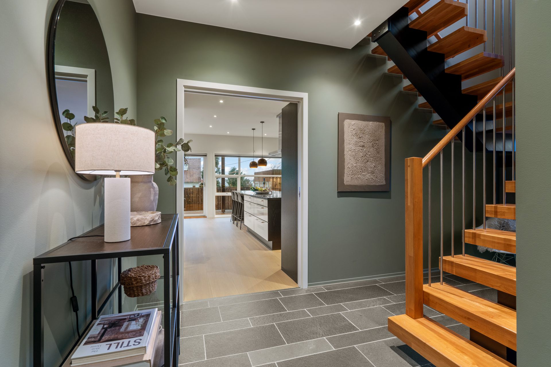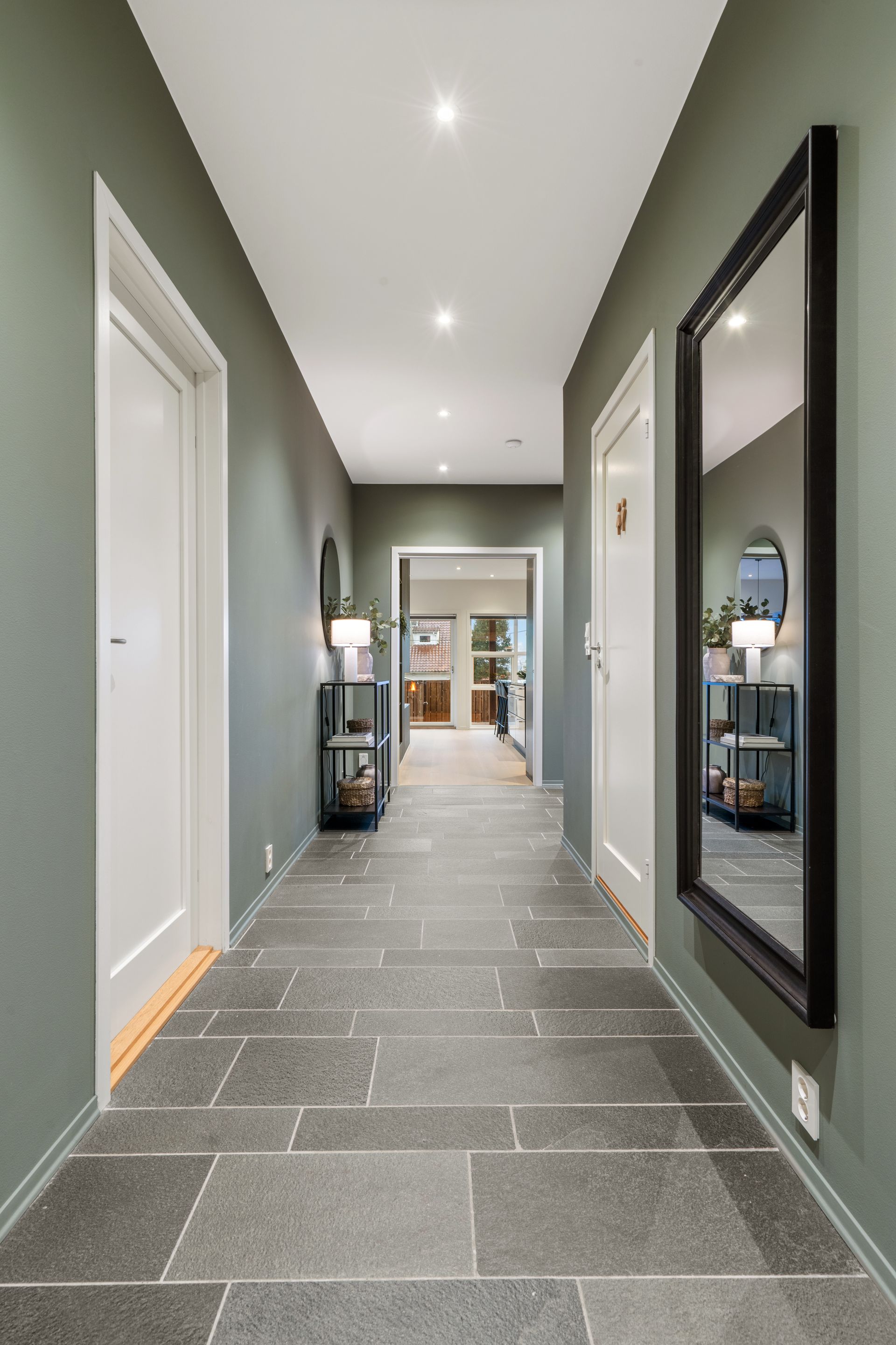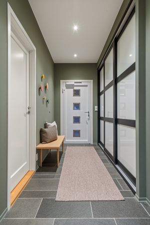 Gang med flott Alta skifer på gulv. Flott skyvedørsgarderobe fra HTH. Behagelig bruk av downlights. Trapp med heltre trinn opp til 2. etasje.
