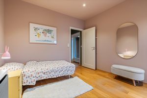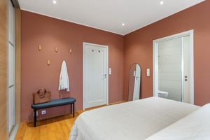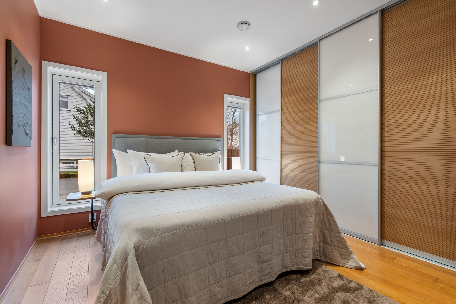 Hovedsoverom/foreldresuite med eget bad. Soverommet har flott heltre eikeparkett. Skyvedørsgarderobe fra HTH. Downlights i tak.