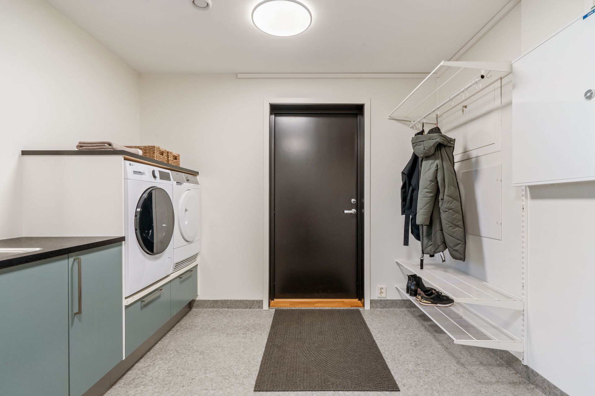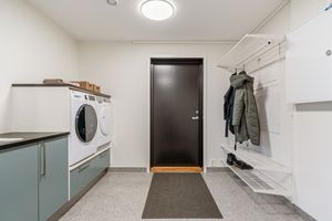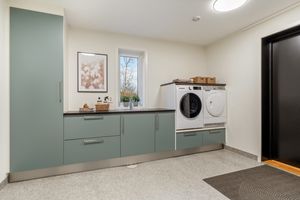 Vaskerom med egen inngang og skittentøys-sjakt fra 2. etasje. Flott innredning til vaskemaskin og tørketrommel. Nyere belegg.