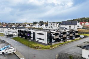 Moderne leilighetsbygg med flat takkonstruksjon trolig tekket med sarnafil eller lignende. Vinduer med karmer av tre med moderne svart utførelse innvendig og isolerglass. Ytterdør med karm av tre. Dørblad i malt utførelse.