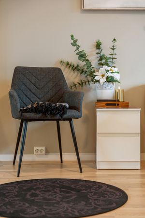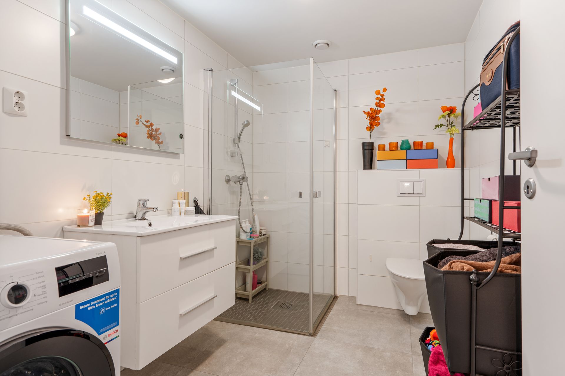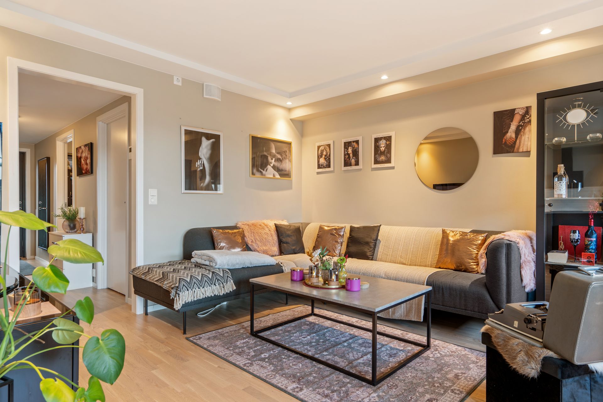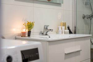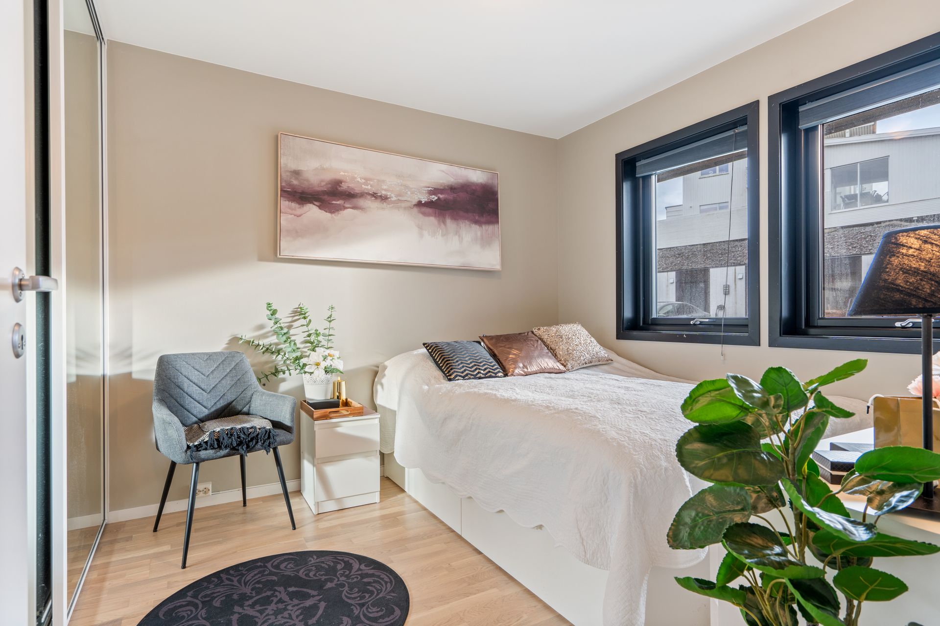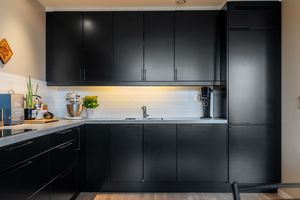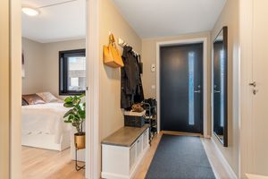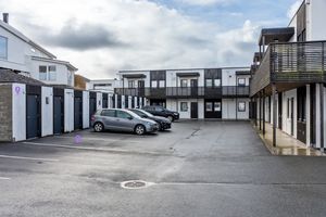 -Helfliset baderom med dusjhjørne, vegghengt toalett, baderomsmøbel med servant og opplegg for vaskemaskin. Store grålige 60x60 gulvfliser kombinert med lyse fliser på vegg gir et svært moderne og pent uttrykk. Gulvvarme. -Sorte vinduer, terrasse dør og ytterdør med sorte lister gir en ekslusiv look. (hvite lister rundt ytterdøren og innerdørene). -Leiligheten er oppgradert med større kjøkkeninnredning, sorte fronter og integrerte hvitevarer. Integrerte hvitevarer som stekeovn, micro, kjøleskap og oppvaskmaskin. -Det er også montert varmepumpe som sørger for en behagelig inne temperatur, samt svært energieffektiv oppvarming av leiligheten. -Oppgradert belysning i stue/kjøkken med downlights. -Skyvedørsgarderobe på hovedsoverommet. -Utendørs er det støpt platting med overbygg. Vestvendt. -Privat parkering rett foran utvendig sportsbod.