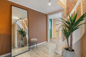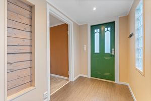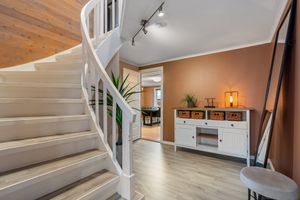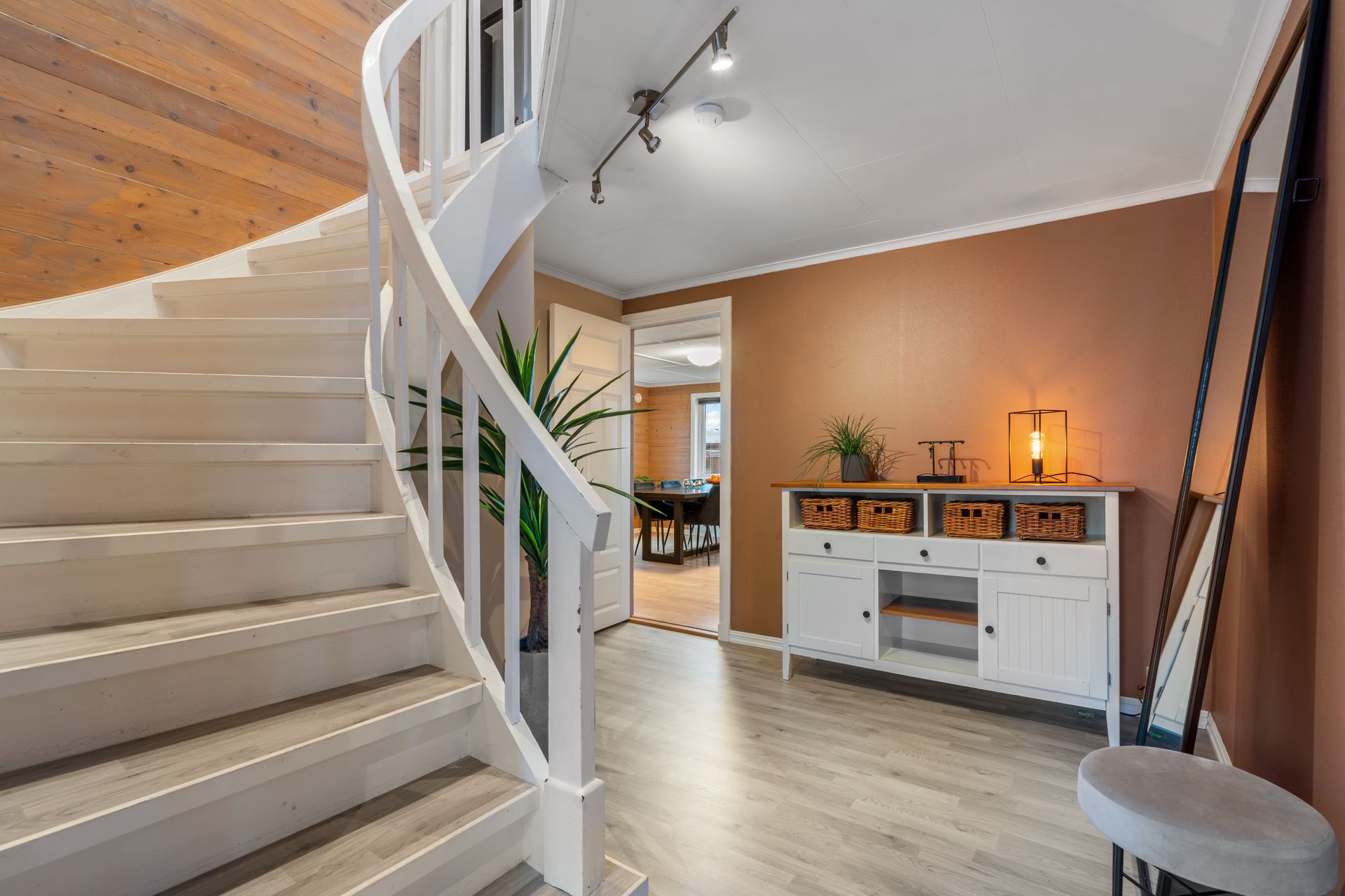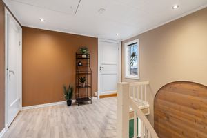 Romslig og lyst vindfang med skyvedørsgarderobe for oppbevaring. Videre er det en gang med trapp opp til loftsetasjen. I gangen er det plass til ønsket møblement.