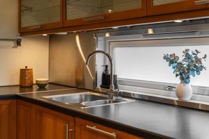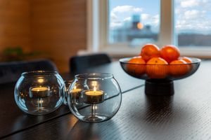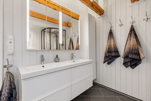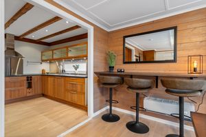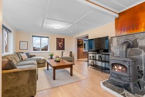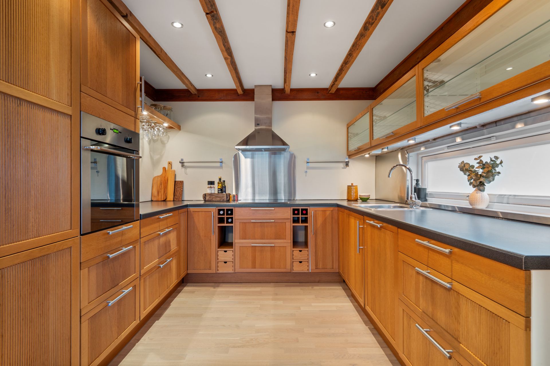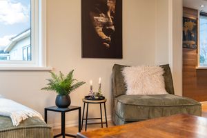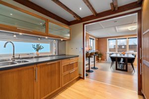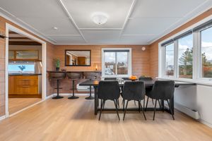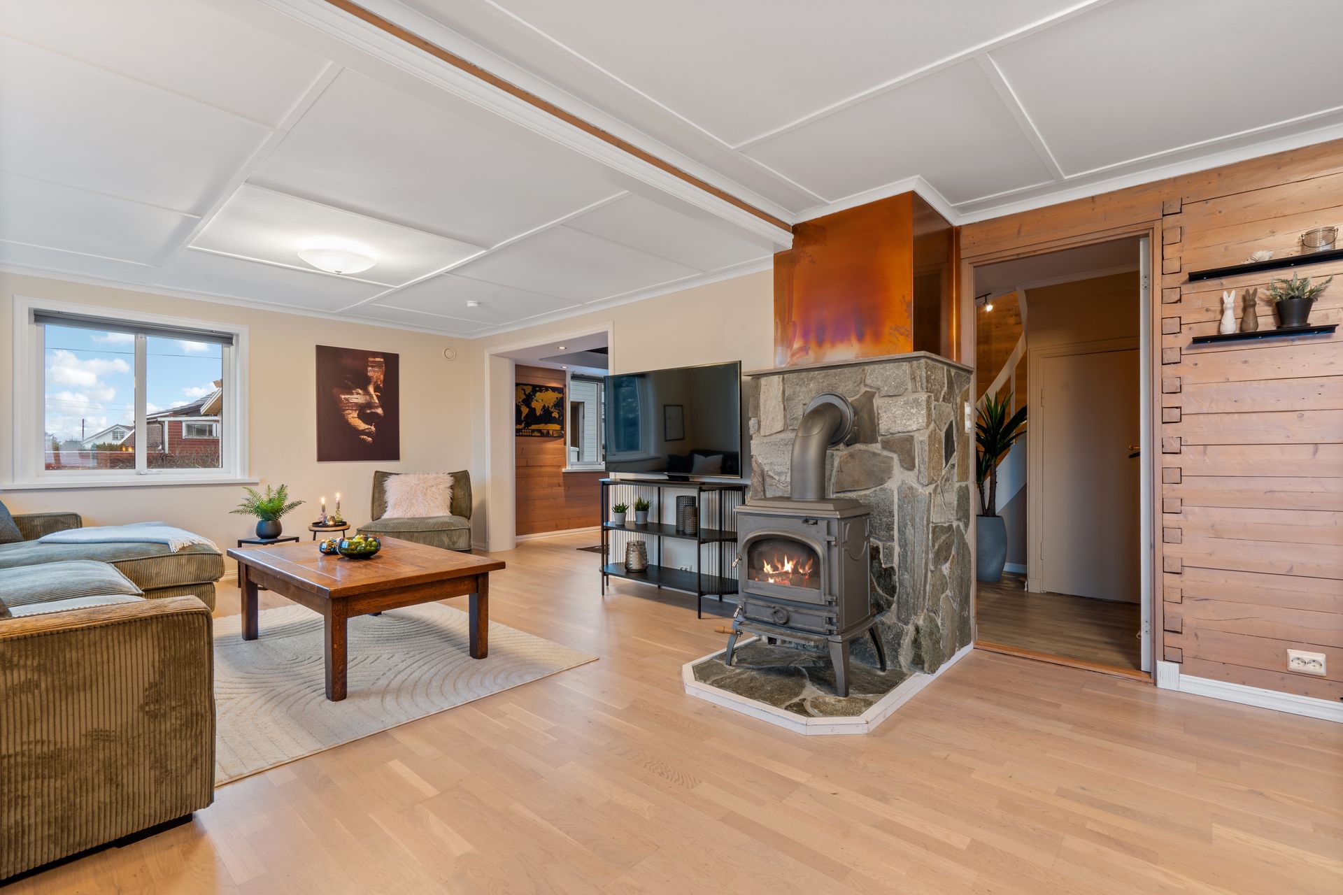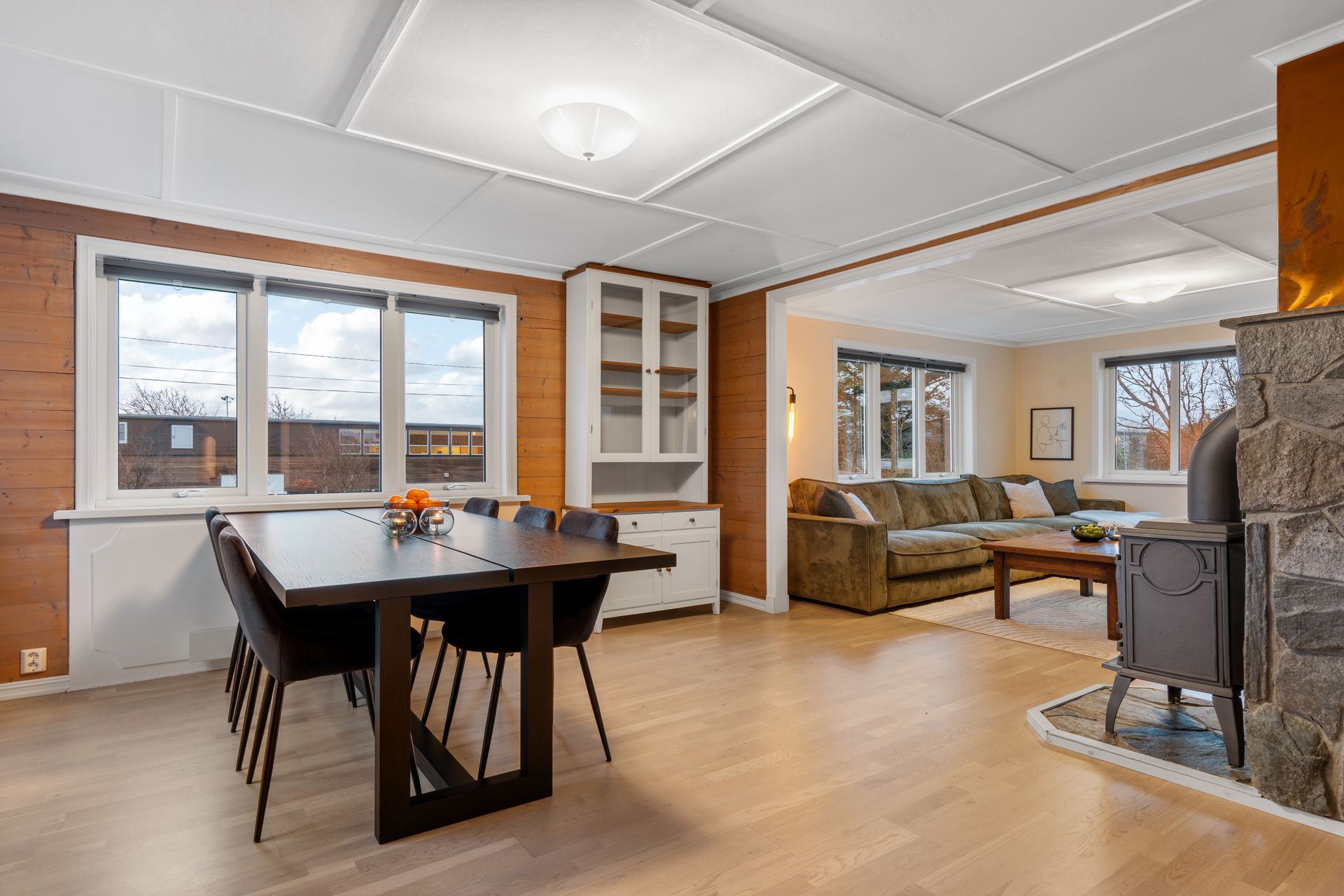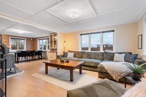 Stue og kjøkken ligger i tilknytning til hverandre i boligens hovedetasje. Kjøkkenet er funksjonelt utformet med rikelig med skap- og benkeplass, samt integrerte hvitevarer og detaljer som gir et helhetlig preg. Boligens særpreg kommer tydelig frem gjennom synlige takbjelker, et element som går igjen flere steder i huset. Stuen er av god størrelse og gir plass til både spisegruppe og sofa, samt en naturlig sone for TV-stue.
