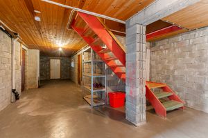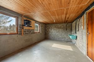 Bolig har parkett og laminat på gulv, betonggulv i kjeller der noen er malte.